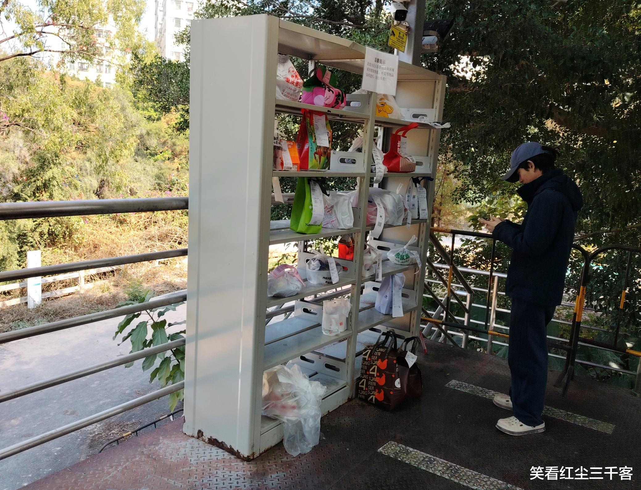 放货架就放货架吧,怎么这货架上贴的这个温馨提示让人这么费解呢?上面写着:此处为无人看管的公共区域,请勿摆放快递、外卖等物品,如有遗失,自行负责!