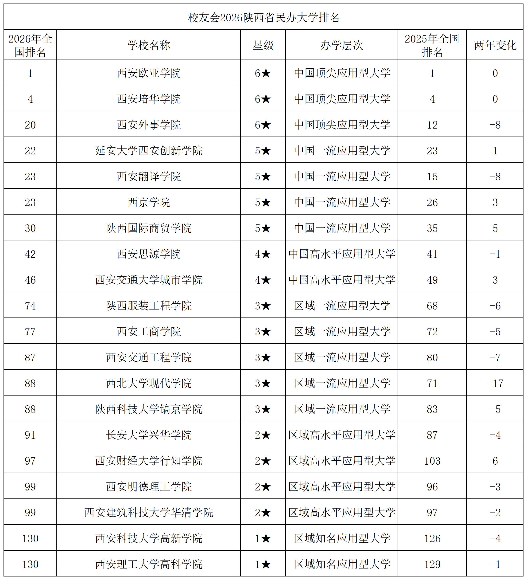 校友会2026年陕西民办大学排名最高的是西安欧亚学院,排名第1,其次是西安培华学院,排名第4,西安外事学院排名第20位,延安大学西安创新学院排名第22位、西京学院排名第23位、西安翻译学院排名第23位。西北大学现代学院下降了17位,西安外事学院 和西安翻译学院 各下降了8位。