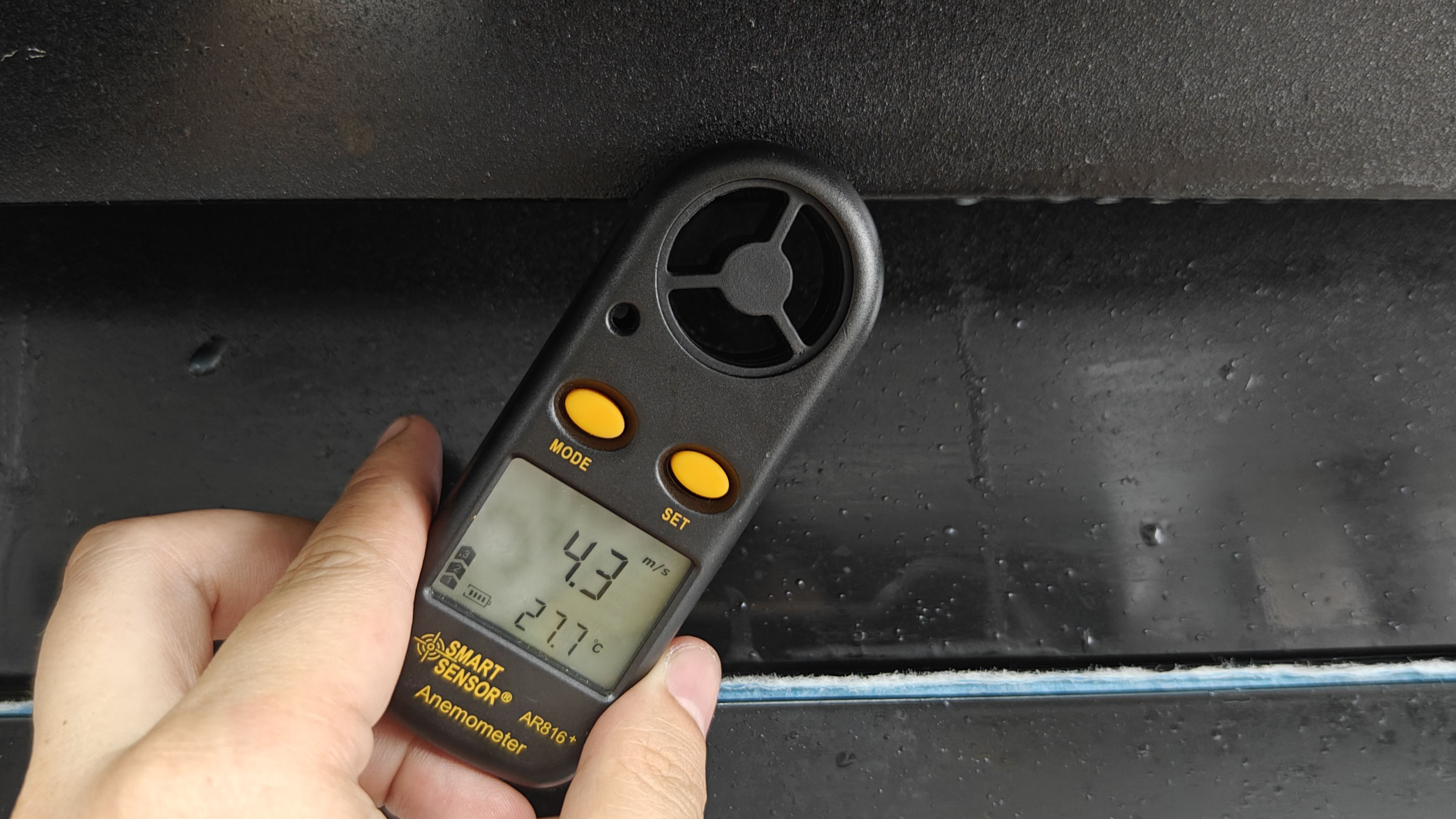展现实力最好的方式当然是对比,先来看看我家旧房子现在正使用的某品牌油烟机的表现,将油烟机的挡位开到最大,通过风速仪测试吸烟口的风力,实测只有4.3m/s,非常一般,即使算上使用过一段时间,由于油污带来的损耗,目测也不过超过5m/s。