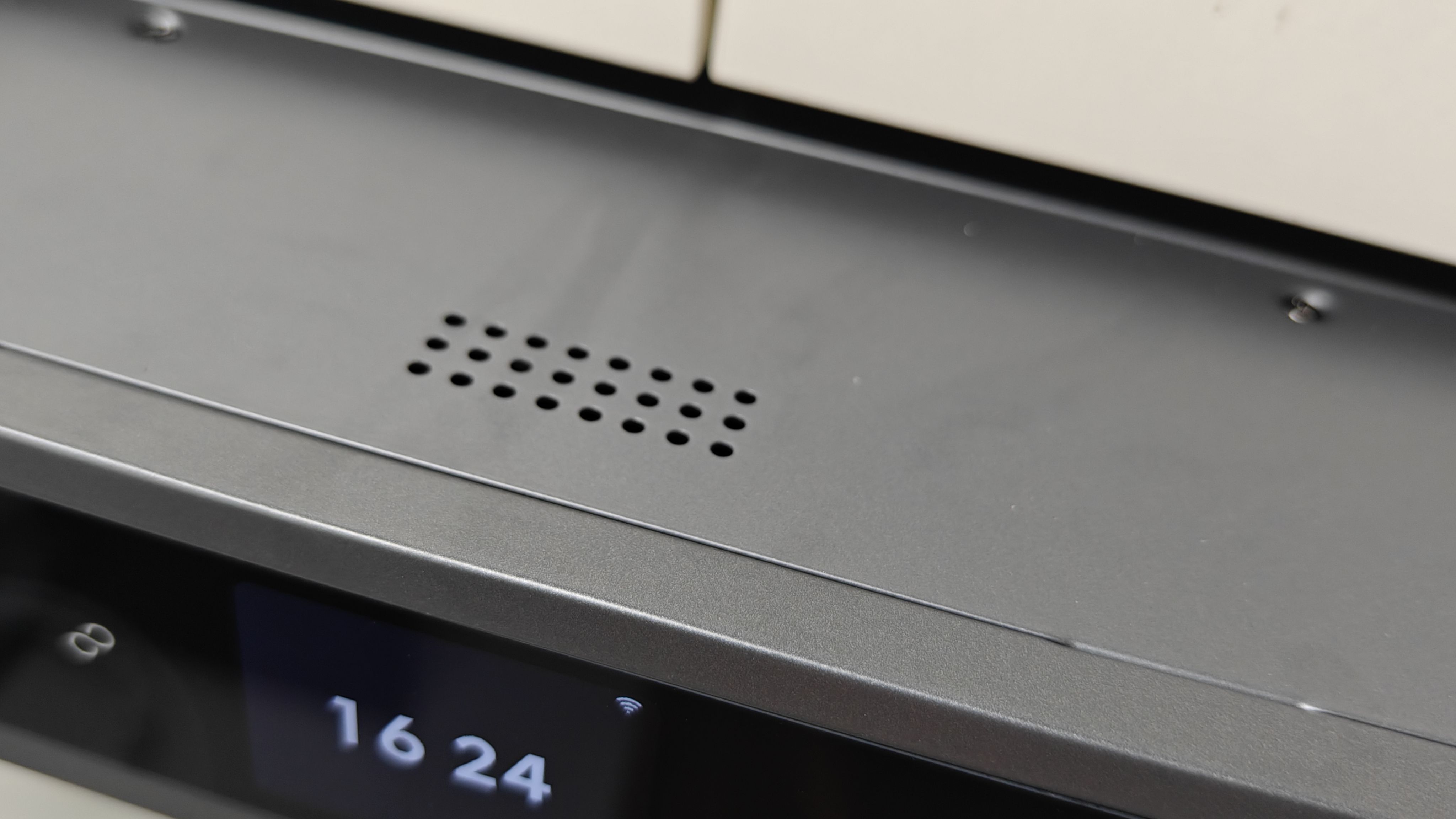 前面有一块触控显示屏,支持挥手感应功能,可以手动开关净烟机、控制风量、照明灯等功能。值得一提的是,这个屏幕的触控响应速度比较灵敏,上手难度低,用起来也方便。此外,在净烟机开启时,中间的数值代表PM2.5指数,可以实时检测到厨房内PM2.5是否超标,让人心里有个底。在安装的时候,师傅也会对空气PM2.5实时测试对比,以确保安装好的米家净烟机PM2.5显示是准确的。