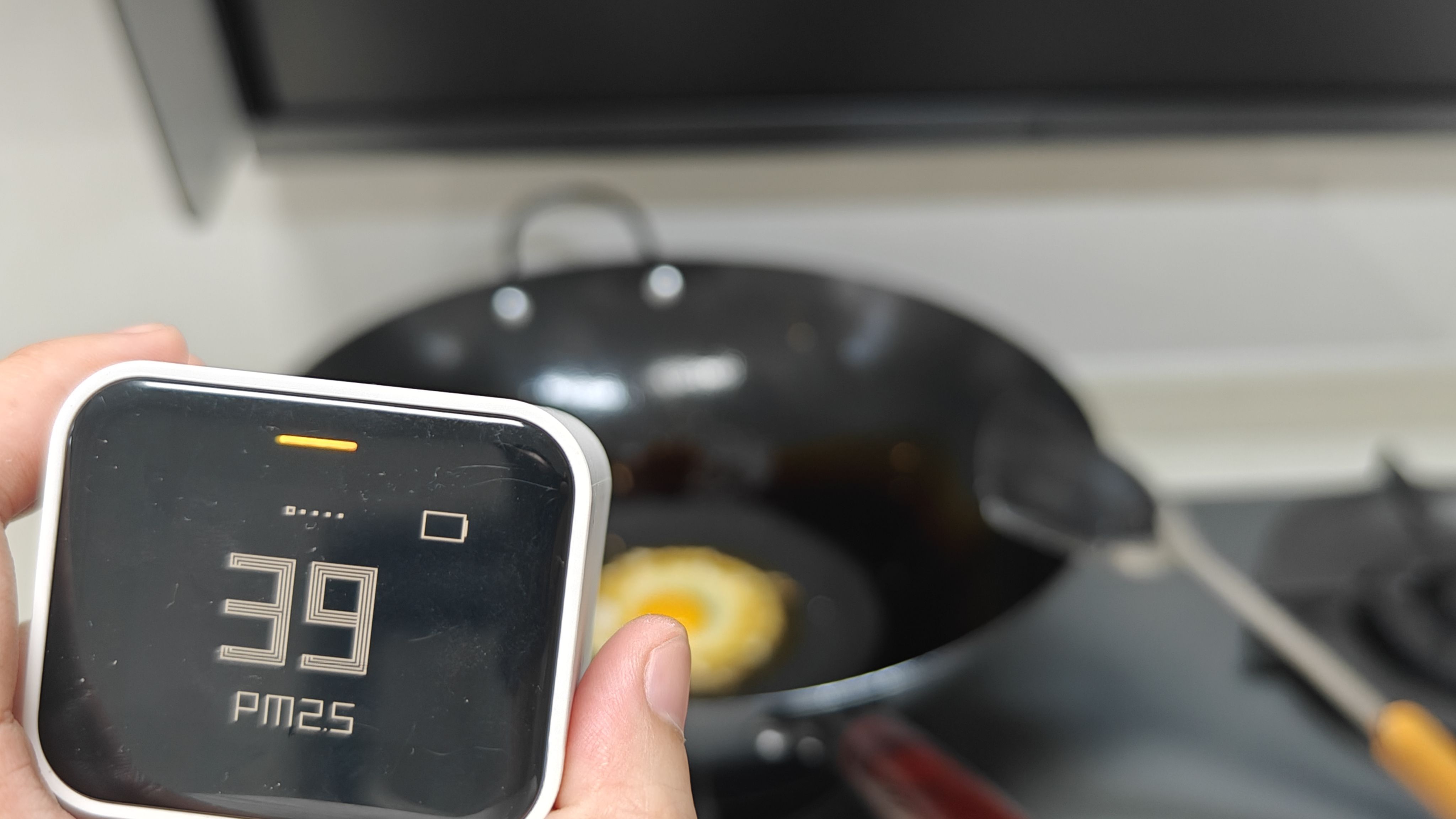 既然油爆辣椒都能搞定,那么炒其它菜必然是轻松拿捏,比如我们煎鸡蛋时,PM2.5指数牢牢控制在40以内。