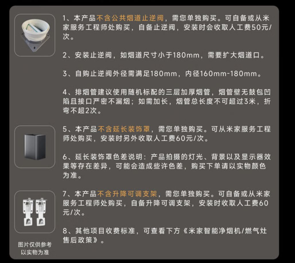 二是准备好一些辅助配件,主要是止逆阀、燃气管、装饰罩、升降可调支架,止逆阀和燃气管这两个自己买的话可以省一点,如果止逆阀可以在硬装阶段提前装好,额外可以省一个配件费。当然,如果觉得自己买麻烦没保障,可以从安装师傅那里购买,有每个品牌都有明码标价,自己留个心眼核对一下价格即可。