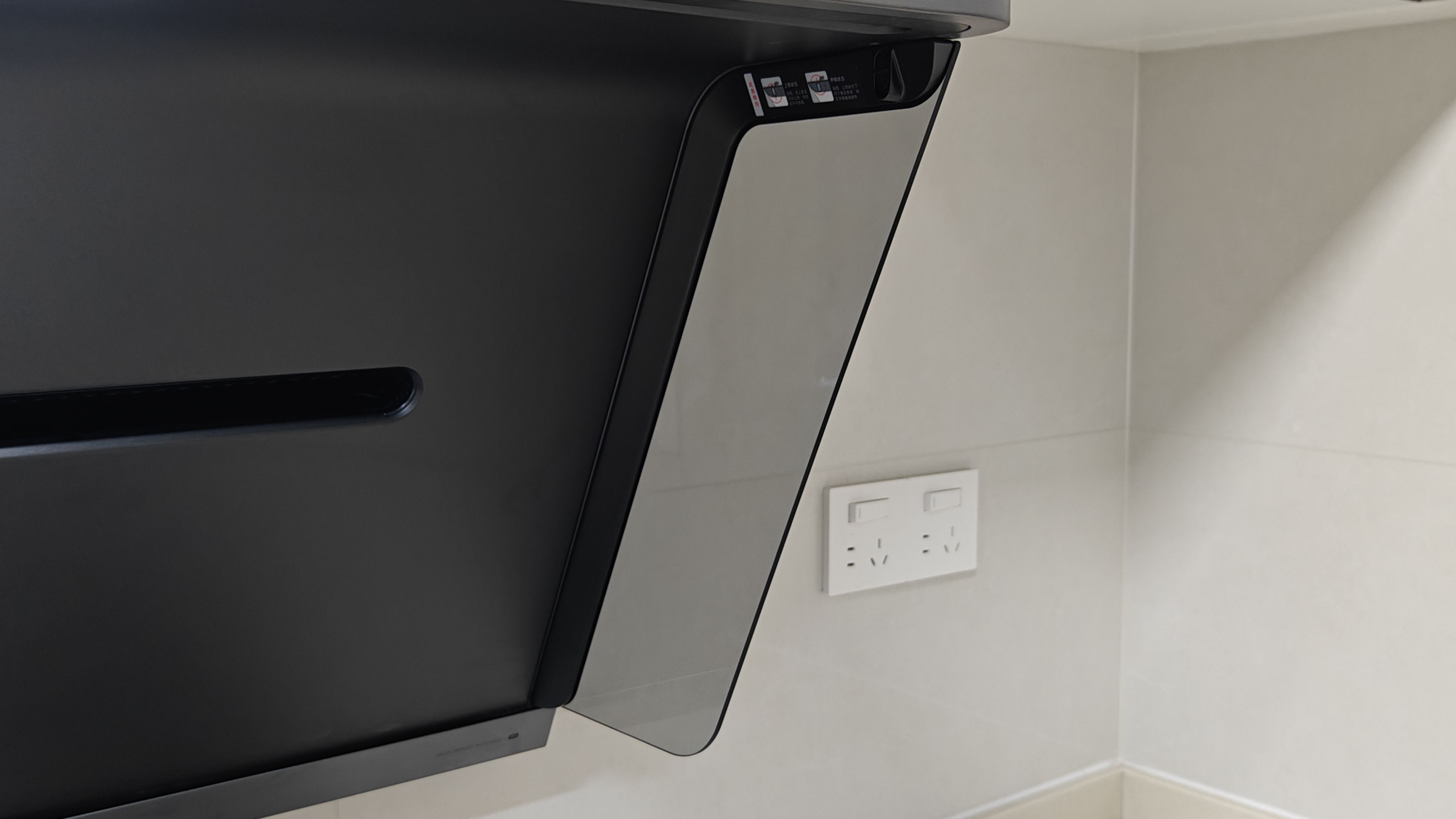 米家净烟机P1是一款侧吸式的油烟机,采用黑灰色的配色,整体外观颜值个人觉得还是蛮高的,与我家这个白色橱柜黑白搭配还挺好看。做工上也比较出色,漆面喷涂细腻,边缘没有毛刺。