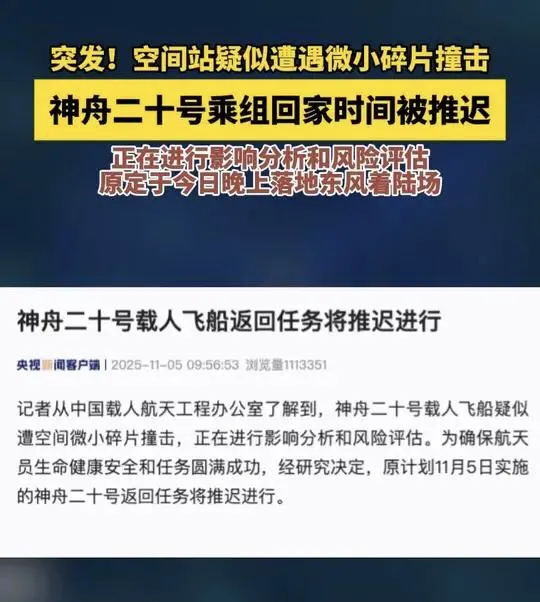 2025年11月5日凌晨,中国载人航天工程办公室发布简短通报,原定于当日实施的神舟二十号载人飞船返回任务推迟。