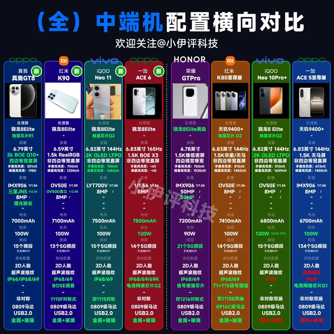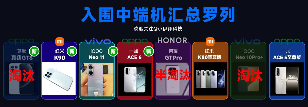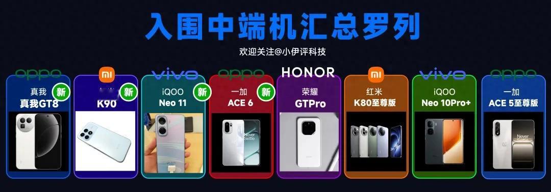 分别为四款新发布的中端机——Redmi K90、iQOO Neo 11、真我GT8标准版和一加ACE 6标准版以及四款热度比较高的老款中端机——荣耀GTPro、红米K80至尊版以及iQOO Neo 10Pro+和一加ACE 5至尊版。