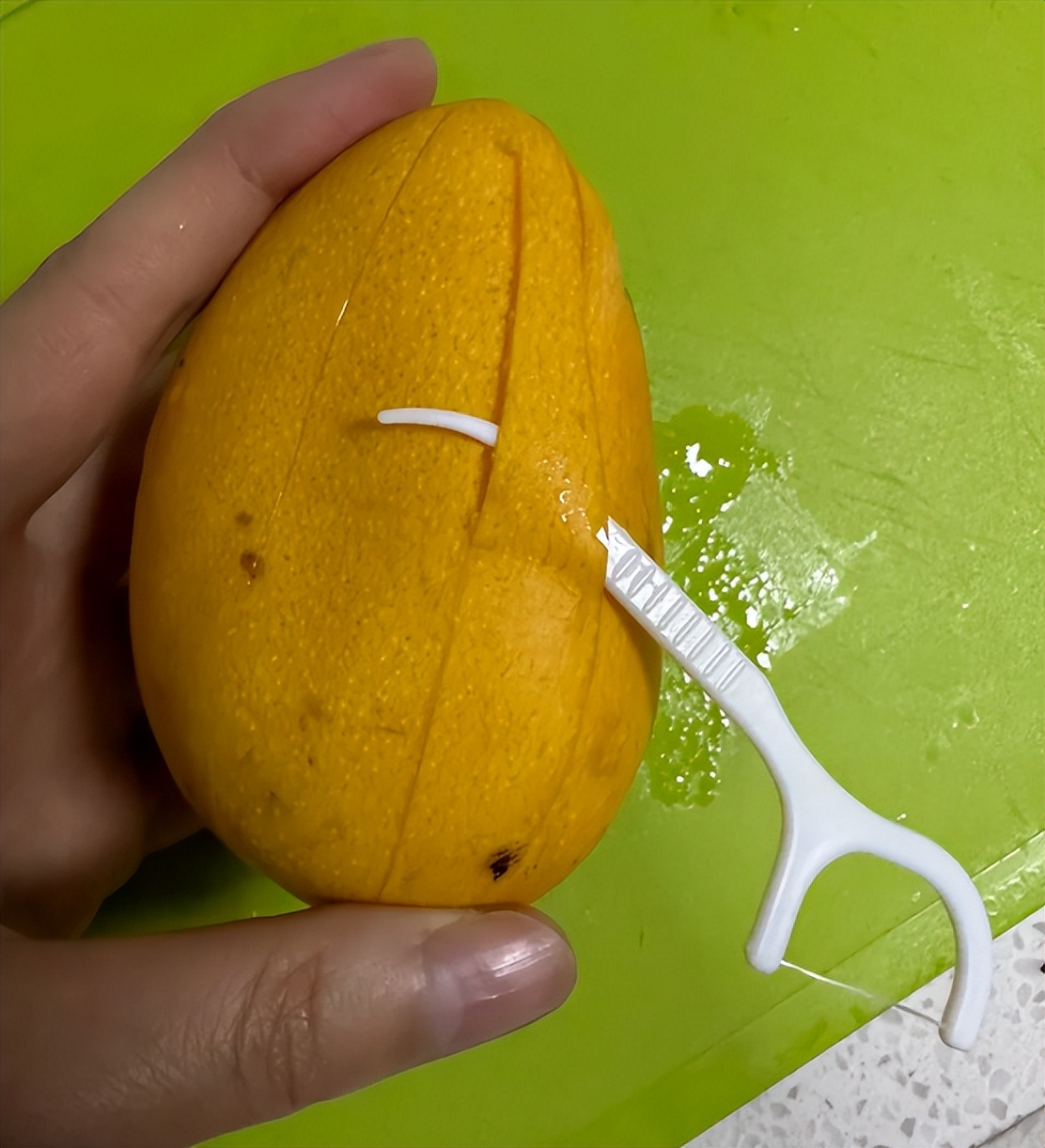 先用牙线尖端在芒果表面划一下,先划个口,从顶端划到底部。