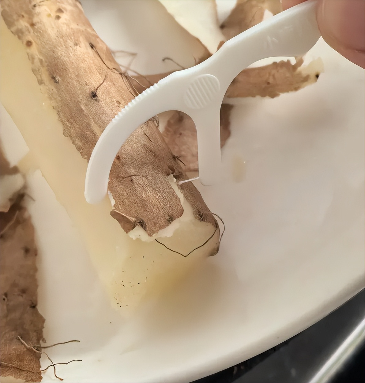 想要把山药削,根本没必要用什么削皮器,只需要一个牙线就能搞定,轻轻松松就可以把山药皮削掉了!