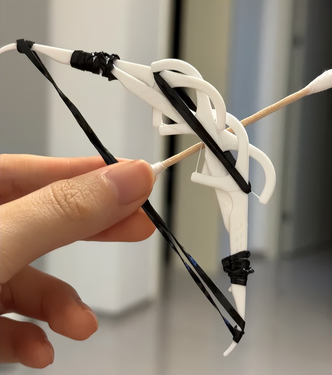 只需要几根牙线,搭配着皮筋、棉签,组装好了之后,一个小弓箭就做好了,玩起来真的很简单。