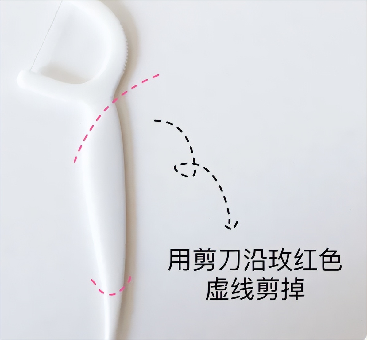 拿出一个牙线,按照虚线,把牙线没用的地方剪掉,只留下中间部分。