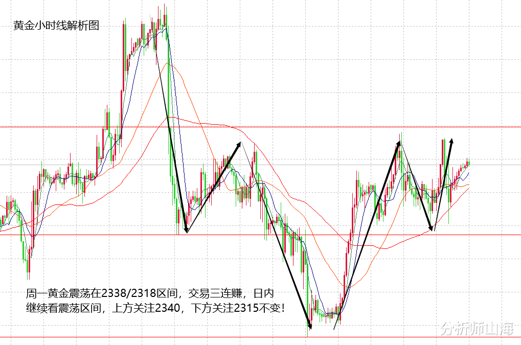 大家早!要明确震荡走势就是区间,交易在重点点位执行,不要贪利润。周一黄金的走势就比较符合山海解析的预期,震荡在2338/2318区间,上方2315不破,下方2340不破,来回高空低多是比较安心的交易策略,所以周一给出的2325多,2324多,2335空,三连赚,获得了不错的利润,现货白银一直持有低位抄底多单,等待这波上趋势力度出现。原油还是保持多头上涨趋势不变,周一提示的81.5支撑看涨,完全符合预期,现在不断刷新高点,只要趋势不变,就不猜高点。期货今天融通金提示551压制可以短空,也实现了548的目标,沪银周一下午没有低多就无法做有效多单,所以观望了一天。