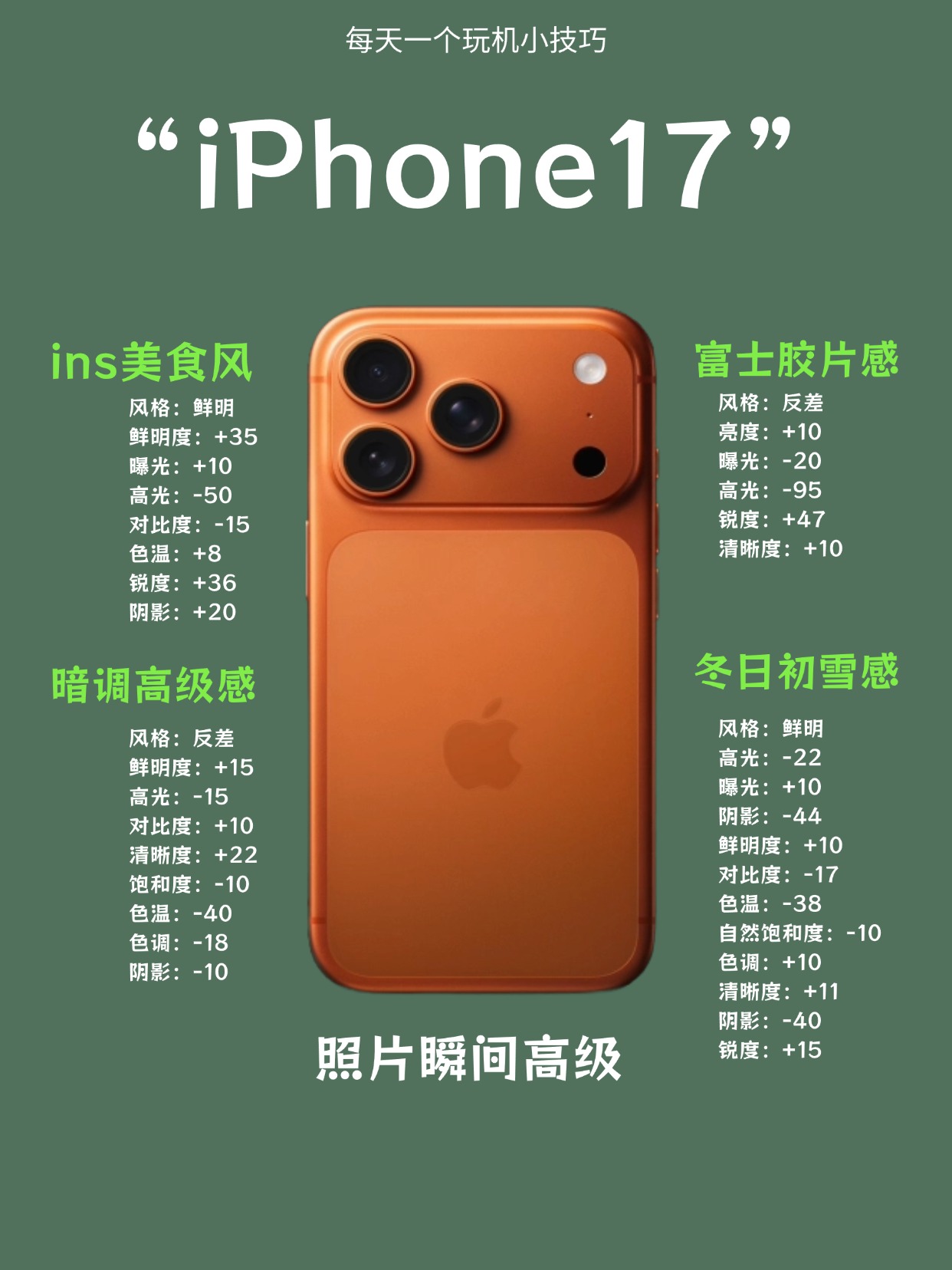 新机相机升级也太顶了吧!到手必试的氛围感调色教程来啦~是不是总觉得拍出来的照片没质感,离网感神图就差一步?这份超全风格调色攻略直接拯救废片!✅打开 iPhone 相册→编辑→按以下参数调整💡Tips:根据实际光线微调 1-2 个数值,出片率翻倍!收藏这篇,以后拍照再也不用愁调色啦~