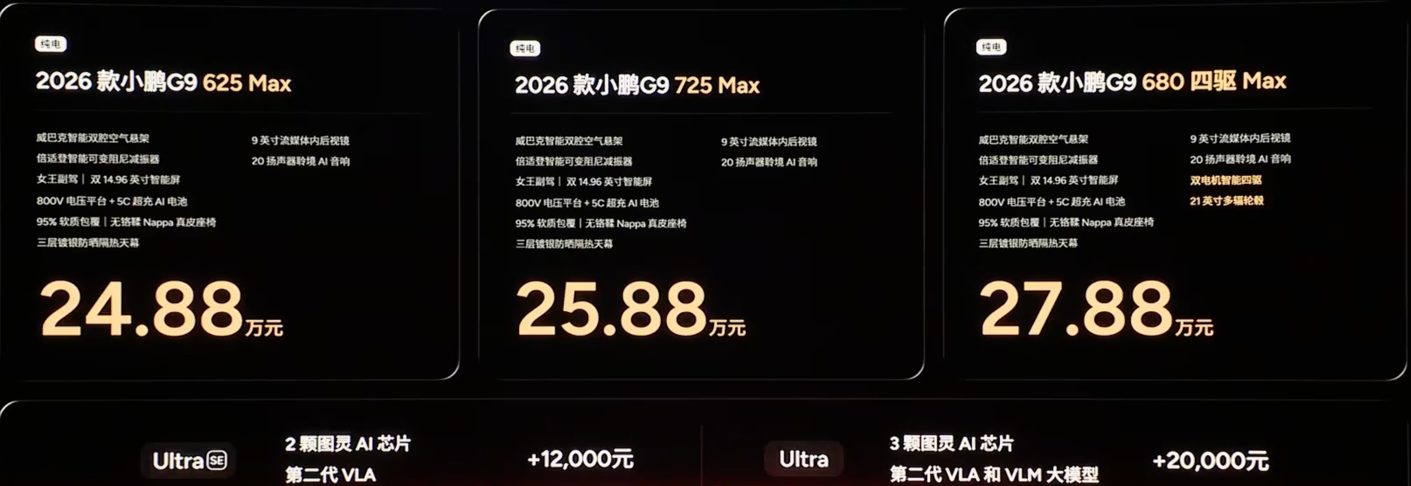 2026款小鹏G9,全系仅提供纯电版本,定位中大型纯电SUV,指导价为24.88-27.88万元,作为年度改款车型,配置分布和旧款保持一致,共推出三款配置,CLTC续航里程分别为625公里、725公里和680公里。