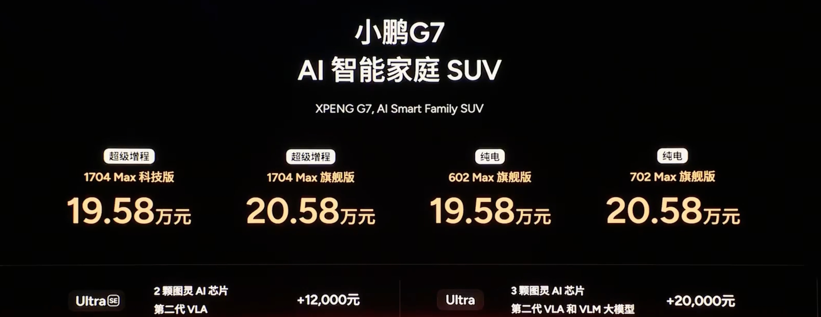 2026 款小鹏 G7和2026款小鹏P7一样推出了四款配置,提供增程、纯电两种动力选择。增程版搭载 1.5T 高效增程器与 55.8kWh 电池组,CLTC 纯电续航 430 公里、综合续航 1704 公里;纯电版分为 CLTC 602 公里和 702 公里两个版本,全系基于 800V 高压平台打造,支持 5C 超充。新车官方指导价 19.58 万 - 20.58 万元,标配天玑 AIOS 6.0 系统与高通骁龙 SA8295P 座舱芯片。