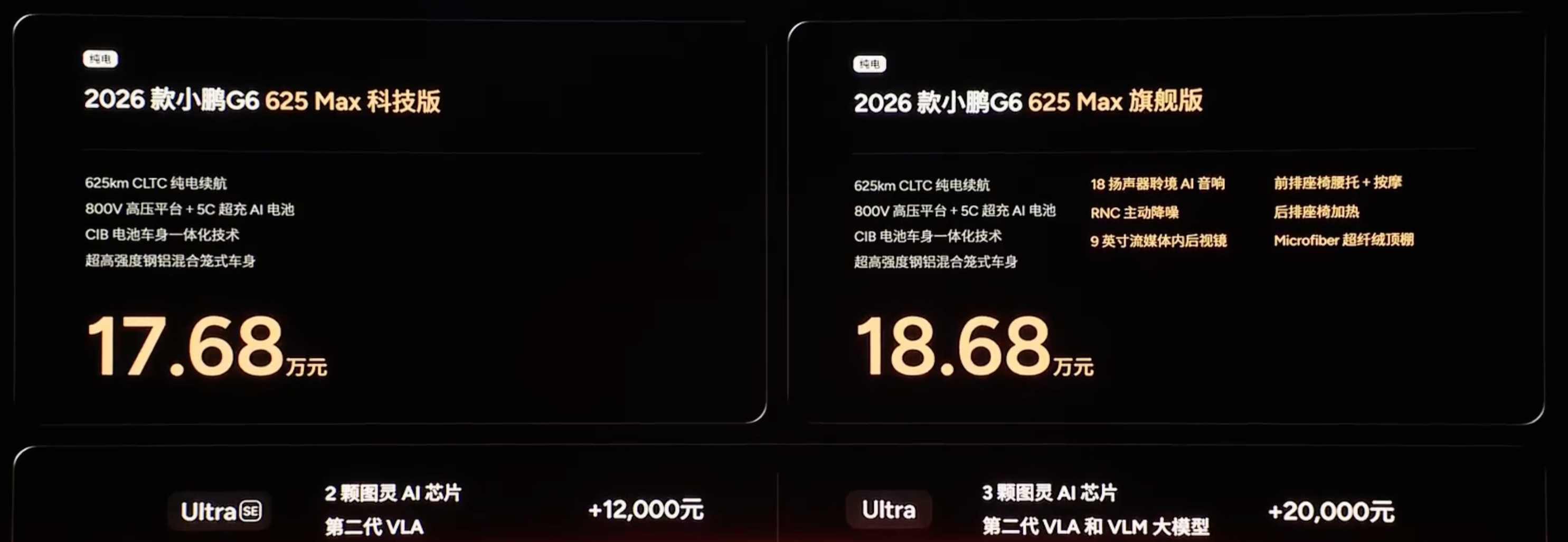 2026 款小鹏 G6,全系仅提供纯电版本,推出 625 Max 科技版与 625 Max 旗舰版两款配置,取消旧款 725 超长续航版本。相较于旧款车型,新车在技术平台、智能硬件、内饰质感及三电系统方面完成多项针对性升级,官方指导价为 17.68 万 - 18.68 万元。
