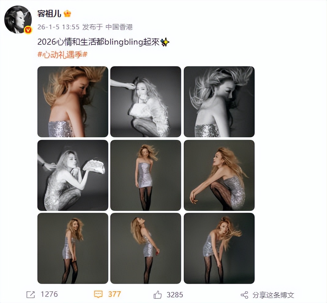 容祖儿的舞台从来带着港乐天后的爆发力,亮片裙甩得带风,高音飙得震场,连发丝飞扬都透着唱跳的张力。可 1 月 5 日她发的这条动态,一句 “2026 心情和生活都 blingbling 起来”,把一身银闪礼服的精致,拍成了和舞台完全不同的调调。亮片不再是炸场的工具,是贴在衣料上的细碎星光,藏着舞台之外的松弛和鲜活。
