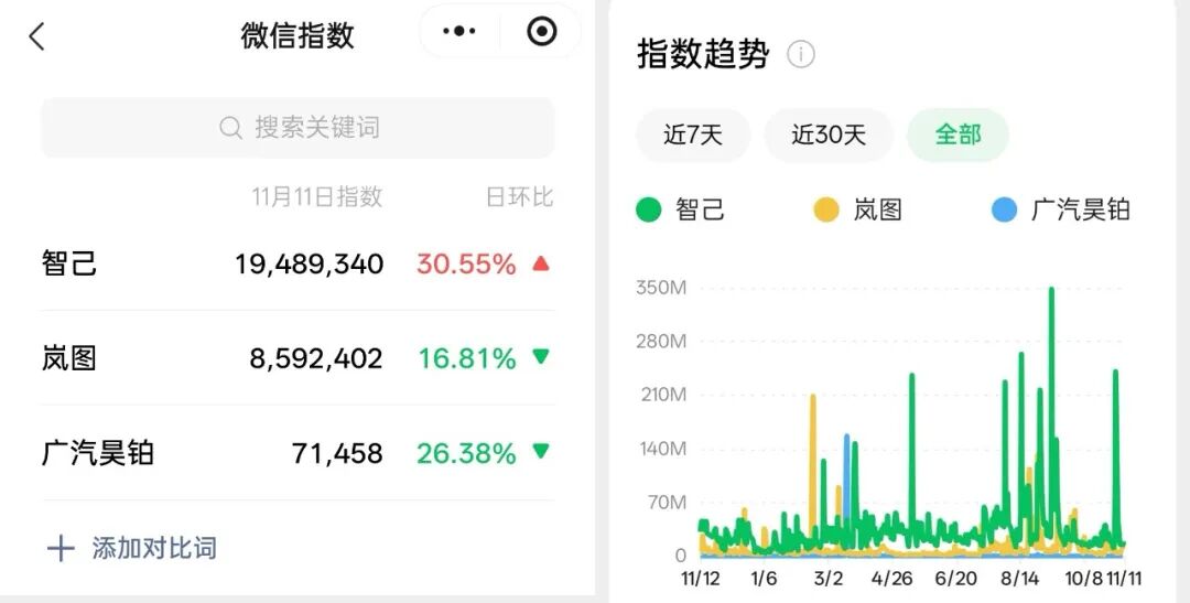 对于广汽昊铂来说,目前最大的问题是大部分买车的人可能想不起还有这么一个选项。不管是在微博热车排行还是微信热车指数,广汽昊铂的数据都长期被智己、岚图甚至极狐压倒。
