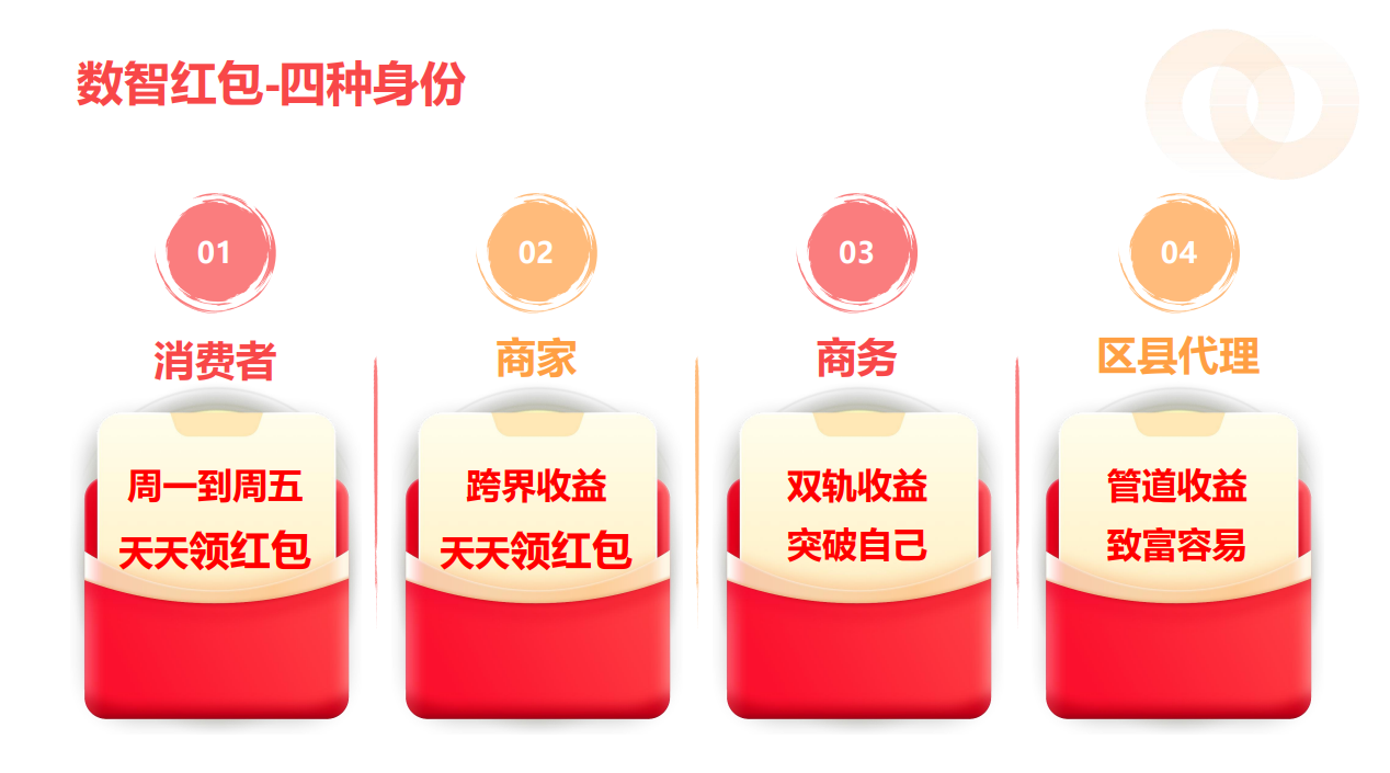 数智红包构建了以消费者、商家、商务代理及区域代理为核心参与主体的“四方协同”生态体系。在这一体系中,各方通过动态分润机制实现价值闭环,共同推动平台的持续发展。