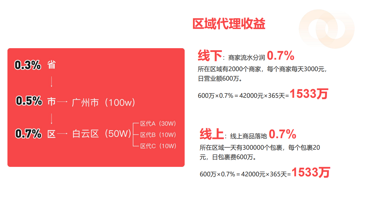区域代理商则通过辖区内商家入驻及交易获得区域代理费和商家营业额的一定比例分润。