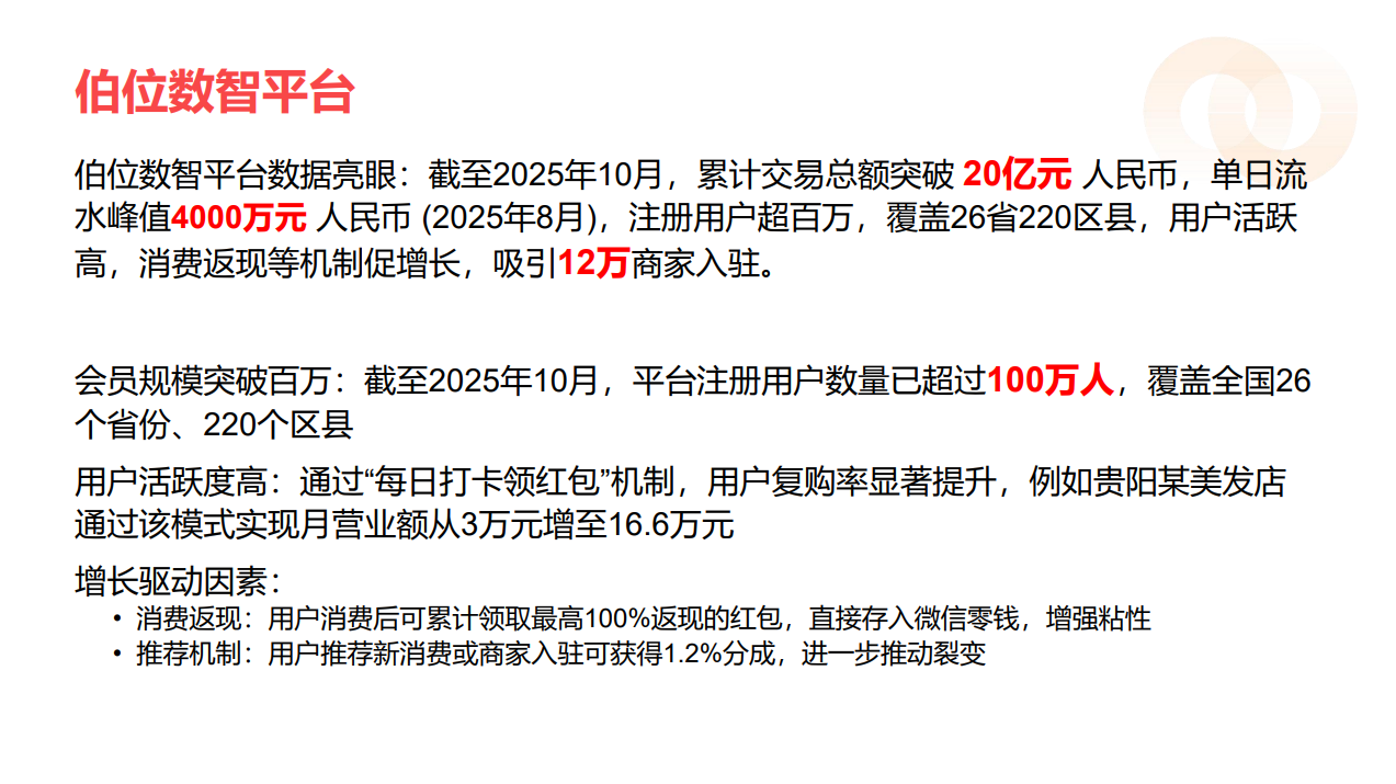 据伯位数智平台数据显示,截至2025年10月,该平台已实现累计交易总额达20亿元,注册用户规模超过百万,业务覆盖全国26个省及220个区县,市场渗透成效显著。这一成绩的取得,得益于数智红包独特的商业模式和高效的运营机制。
