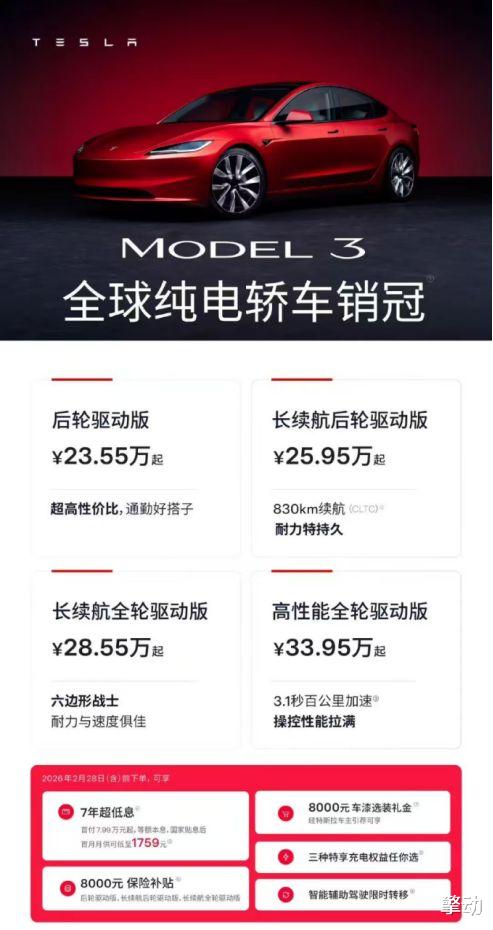 特斯拉是今年第一个吃新螃蟹的车企。继1月初的“七年超低息”之后,1月24日特斯拉又推出限时保险补贴8000元的政策,覆盖Model 3多款主力车型。在当下价格高度透明的新能源市场,这无异于一次“隐形降价”。