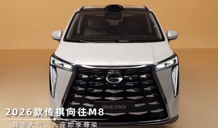 从设计来看,2026款传祺向往M8采用了夸张的前脸设计,进气格栅几乎占据了整个前脸,大尺寸格栅内部采用点阵式布局,配合两侧“7”字形大灯,具备不错的视觉冲击力。另外,新车还将配备 192 线束激光雷达以及智能迎宾投影,迎宾灯又四种预设的主题,可根据个人喜好自定义调节,提升了科技感与仪式感。