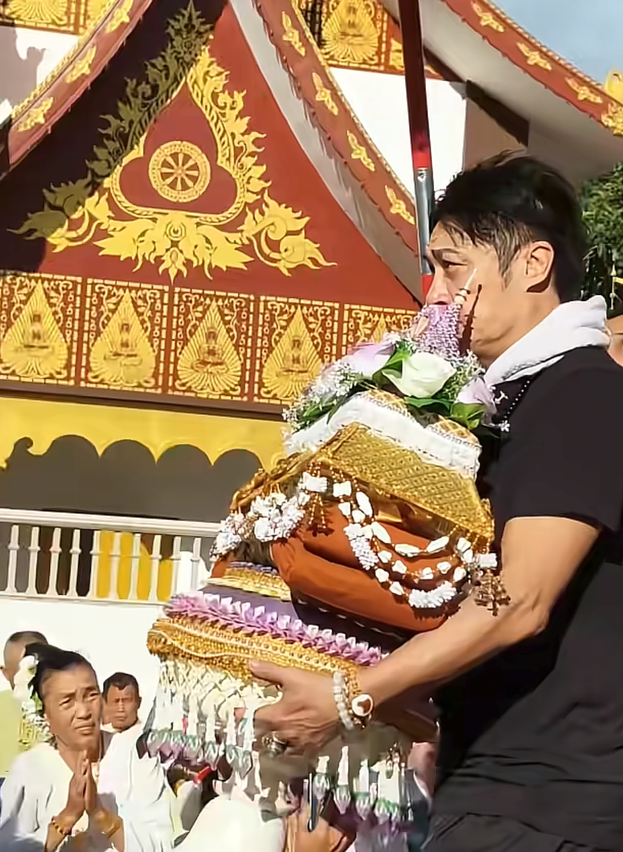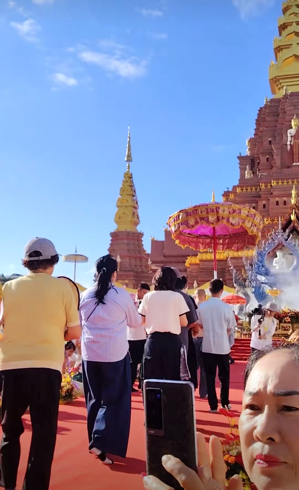 10月27日,有西双版纳的网友晒出了吴镇宇一家现身西双版纳的告庄大金塔寺,参加伽缇娜衣供养法会的视频。