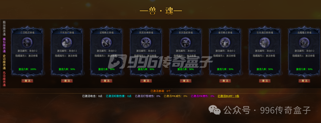 兽魂是这个服比较重要的玩法,在英雄人物栏右上角,击杀相应BOSS,会掉落兽魂。越高级的兽魂,激活的成功率越低,激活后不仅会有基础属性,还会有隐藏属性。还有一点需要注意,这些兽魂的属性,应该是可以叠加的,可想而知,全部激活会有多么强!