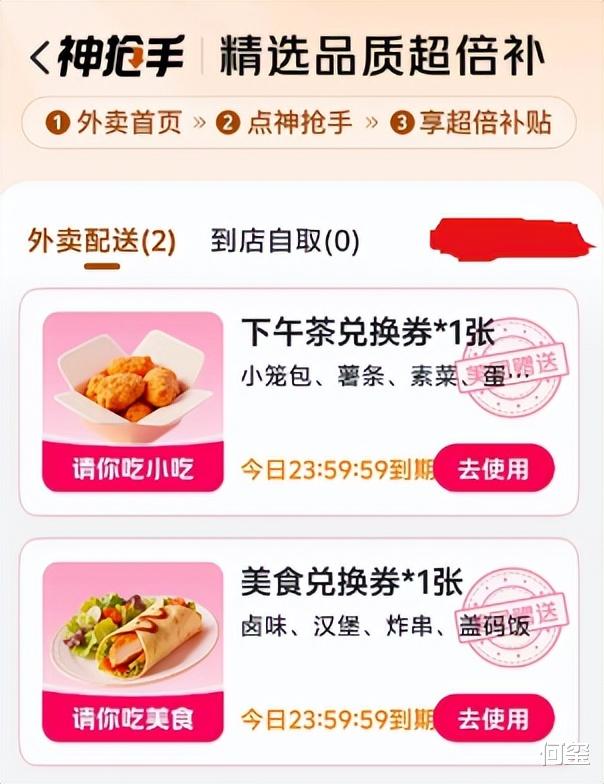 打开APP即有红包提示:您的外卖好礼已经到账,去使用。点进去有两张卷,一张美食兑换券,一张下午茶兑换券。