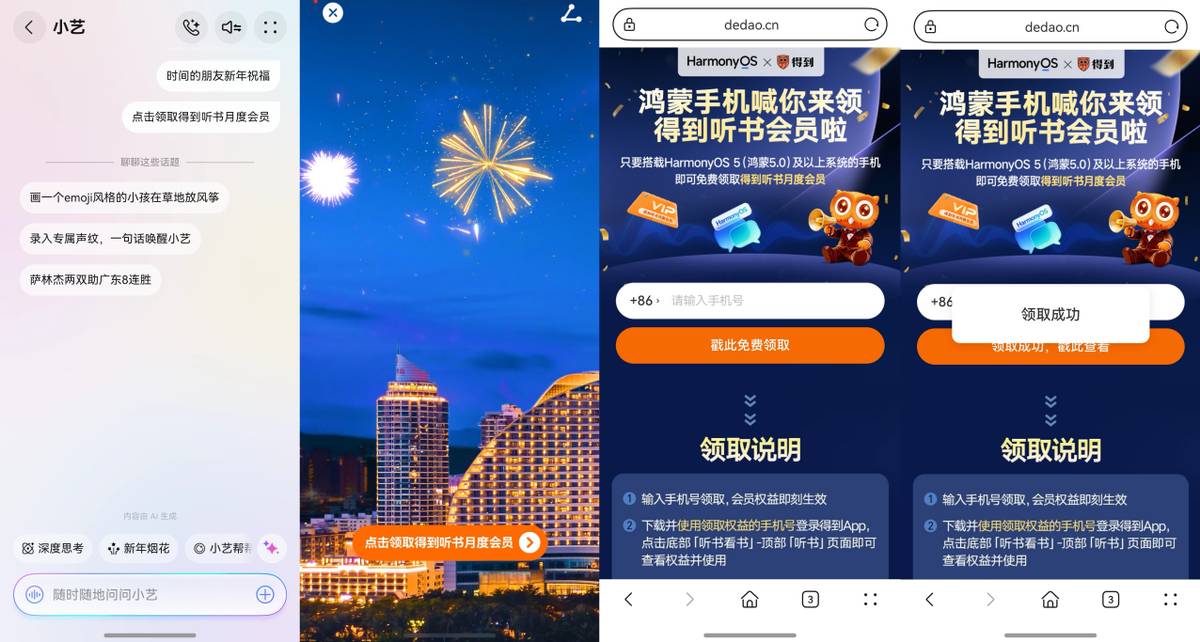 不管你是鸿蒙5还是鸿蒙6用户,只需唤醒小艺,说出或者输入"时间的朋友新年祝福",系统识别后会弹出活动按钮,输入手机号后,就能立即领取得到听书月度会员。活动持续到1月31日,每个手机号限领一次,如果你已经有听书会员,会员权益还会自动顺延。