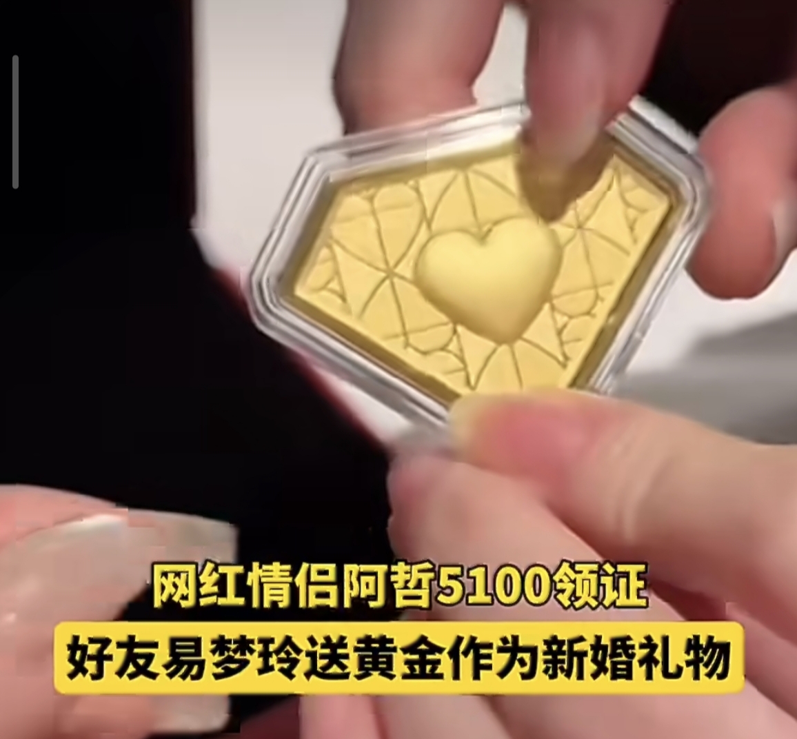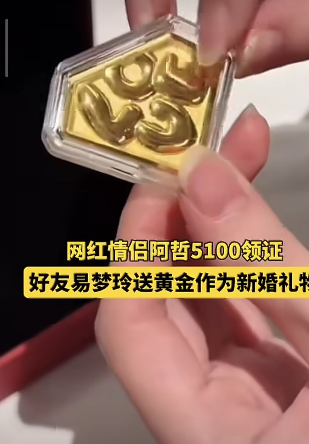 "1314"刚撒完糖,"5100"又亮瞎眼!1月4日,网红圈顶流CP阿哲×5100(倩怡)在湖南民政局扯证,直接把恋爱纪念日玩成"合法同居"启动仪式。全网还没从"老婆"这一声亲昵里缓过神,就被易梦玲的"随份子"名场面锤进柠檬海——人家闺蜜送红包,她直接扛来一整套黄金:爱心、LOVE字样,克重拉满,闪到网友原地化身"人间计算器":这得多少钱?答案:5100元!谐音梗扣钱,但心意值爆表。