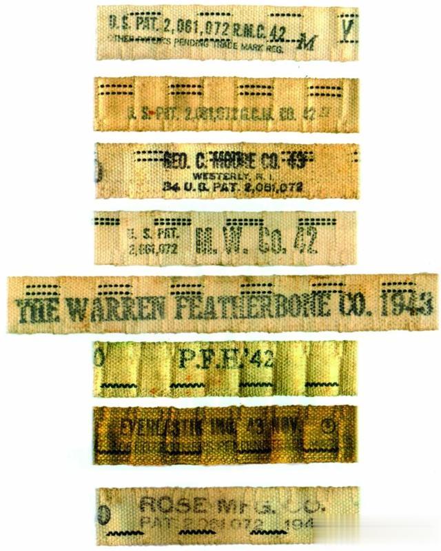 1943年5月,钢原料也变得稀缺起来,因此简装型弹带开始大量生产,这种弹带取消了一端的带柄,取而代之的是用缝合或胶粘的方法来防止其开线。 1943年中期,绿色面料取代了白色面料。鲁赛尔制造公司和斯彻丽格制造公司在1942年早期生产的弹带也被挑染成绿色。 生产数量惊人最初,M1917机枪布制弹带只由鲁赛尔制造公司和斯彻丽格制造公司这两家生产。1942年6月,除了这两家公司外,还有5家生产商陆续投入。后来,越来越多的厂商加入进来。至1942年底,共有13家生产商加入。 1942年6~12月,美国军械部还从英国托马斯父子制造公司进口了489700件M1917机枪布制弹带。这些弹带上印着“G G 1942”和“S.C.C LTD”的标记。其中,字母“G”有可能代表生产月份为7月(G为字母表中第7个字母,故可能表示7月),而“S.C.C.LTD”印记并非托马斯父子公司的名称,只能说明托马斯父子公司是这批产品的中间商了。