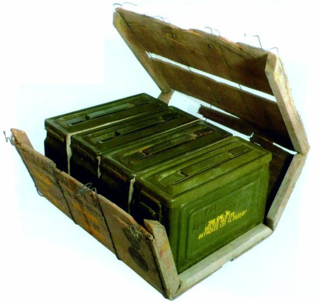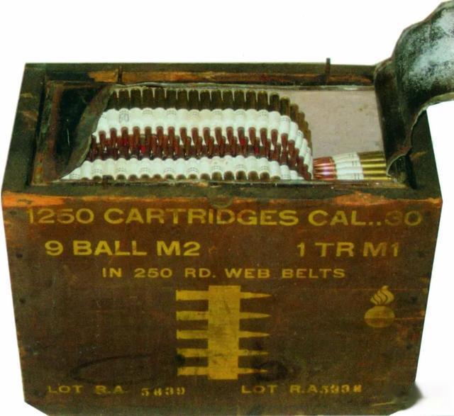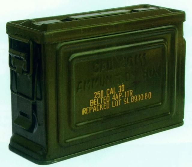 木制和金属弹箱二战之前,装载勃朗宁机枪布制弹带的是带金属里衬的木箱,称为M1917弹箱。这种木箱沿用了一战时弹箱的典型设计,方形箱体,箱底两边均以45°角切割掉一小块,以便挂在枪身上,箱体十分坚固耐用,直到1945年有些部队还在使用这种弹箱。 需要提及的是,早期枪弹并没有装在弹带上,而是20发装入一个纸盒内,每个弹箱装75盒。后期采用弹带后,每个木制弹箱可装5件250发弹带。