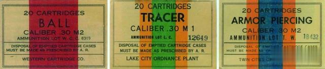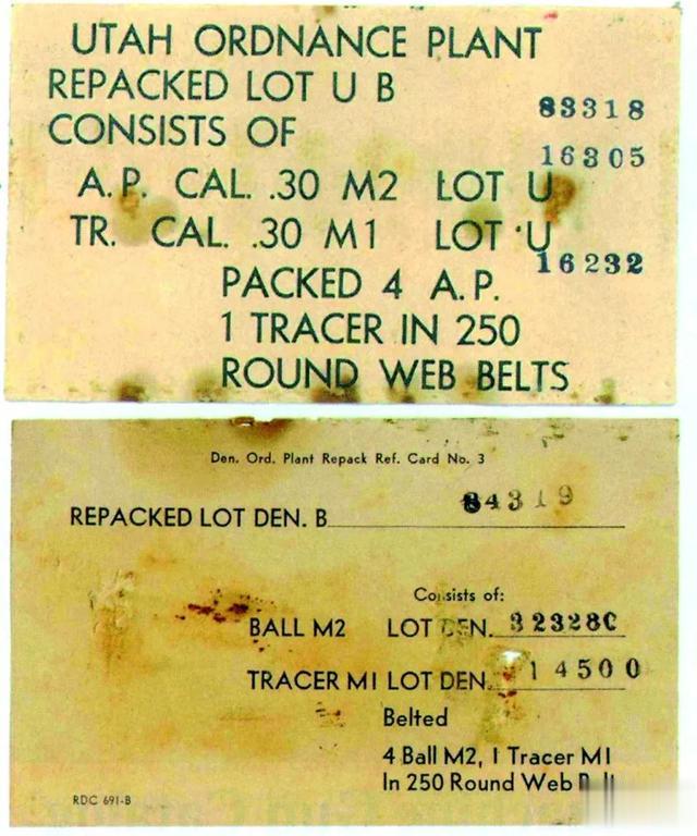 1945年早些时候,再装箱序列号被直接印在弹带上来代替插入箱内的参考数据卡片。印在弹带上的相应标记有“REPACKED LOT”字样,紧随其后的是批号。1945年中期,“REPACKED LOT”逐渐被“Functional Lot”所代替,并编写一组全新序列批号。(原文发表于《轻兵器》2012年第4期下半月刊,公众号文有删改)