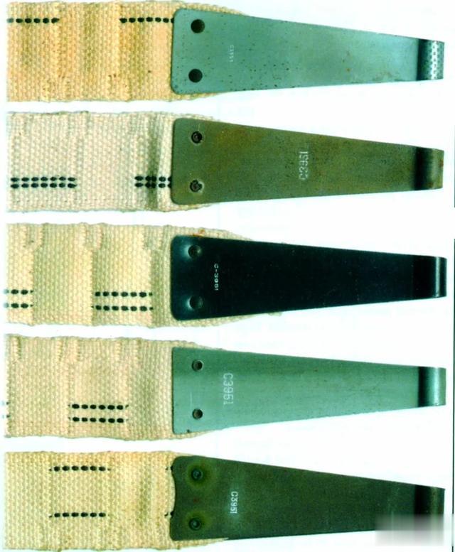 改用钢制带柄 1942年3月,由于黄铜原料稀缺,带柄的用料由黄铜改为钢制。钢制带柄强度高,不易变形,且其表面后来进行了不同的防锈处理,如发蓝、镀锌、镀镉等。 这种81mm长的钢制带柄也呈锥形。在与弹袋组装时,为了简化先在弹带上打钉孔,再将弹带面料修剪成相应的锥形,最后将其铆接的组装程序,在1942年10月采用了一种新的铆钉一体式带柄,其最关键的改进是把两个片状铆钉直接成型于带柄上,然后将其钩在弹带的相应位置加以固定。后来,这种一体式带柄成为弹带的标准式样。