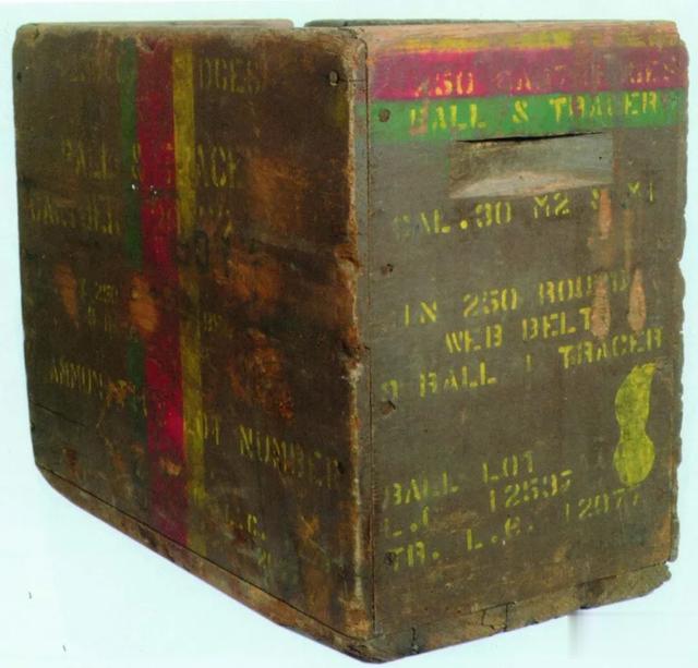 M1917木箱,内装5件250发弹带,其上的蓝黄绿彩色条代表穿甲弹和曳光弹