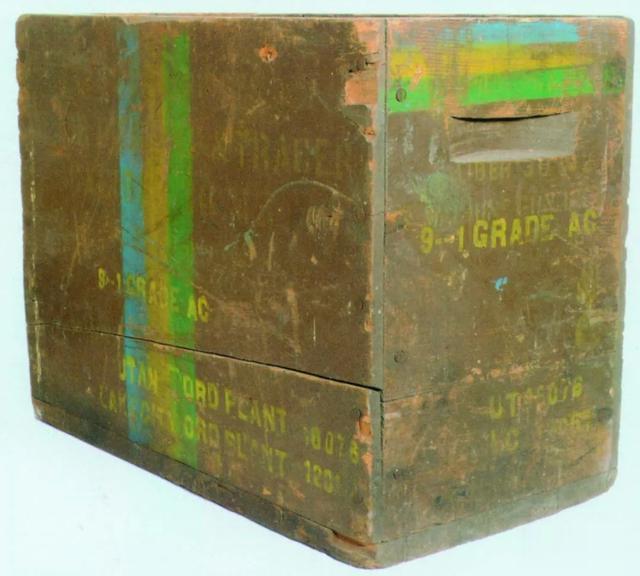 M1917木制弹箱外观,其上的绿红黄色条代表其中装有普通弹和曳光弹