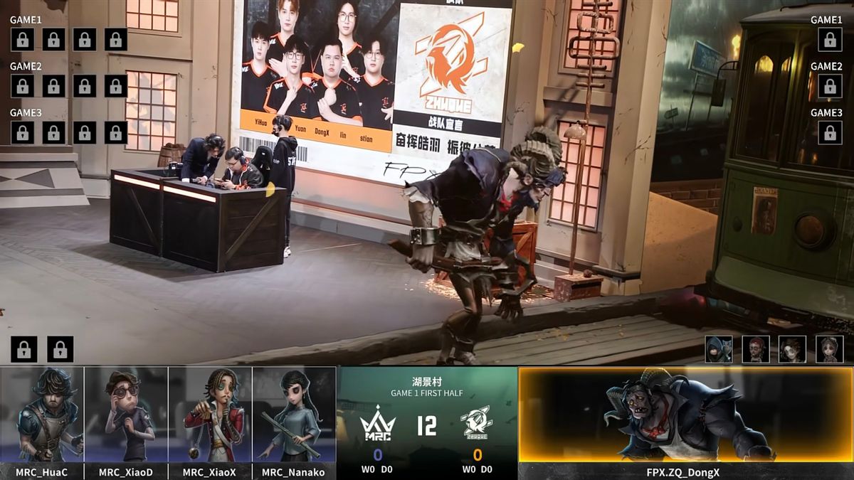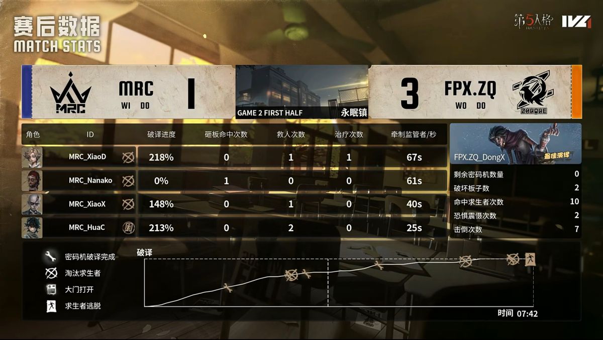 MRC的求生者选择了飞行家、幸运儿、大副、古董商;FPX.ZQ的监管者DongX选择了“跛脚羊”。(BAN先知、咒术师、木偶师、机械师)