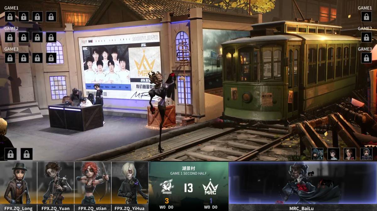 FPX.ZQ的求生者选择了魔术师、木偶师、弓箭手、守墓人;MRC的监管者BaiLu选择了歌剧演员。(BAN先知、古董商、大副、冒险家)