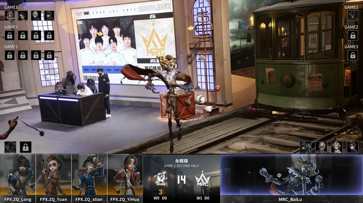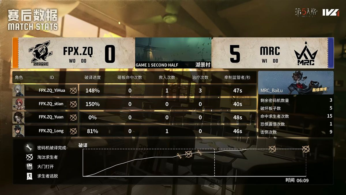 FPX.ZQ的求生者选择了飞行家、空军、火灾调查员、大副(BAN“跛脚羊”);MRC的监管者BaiLu选择了“喧嚣”。(BAN先知、“逃脱大师”、气象学家、幸运儿)