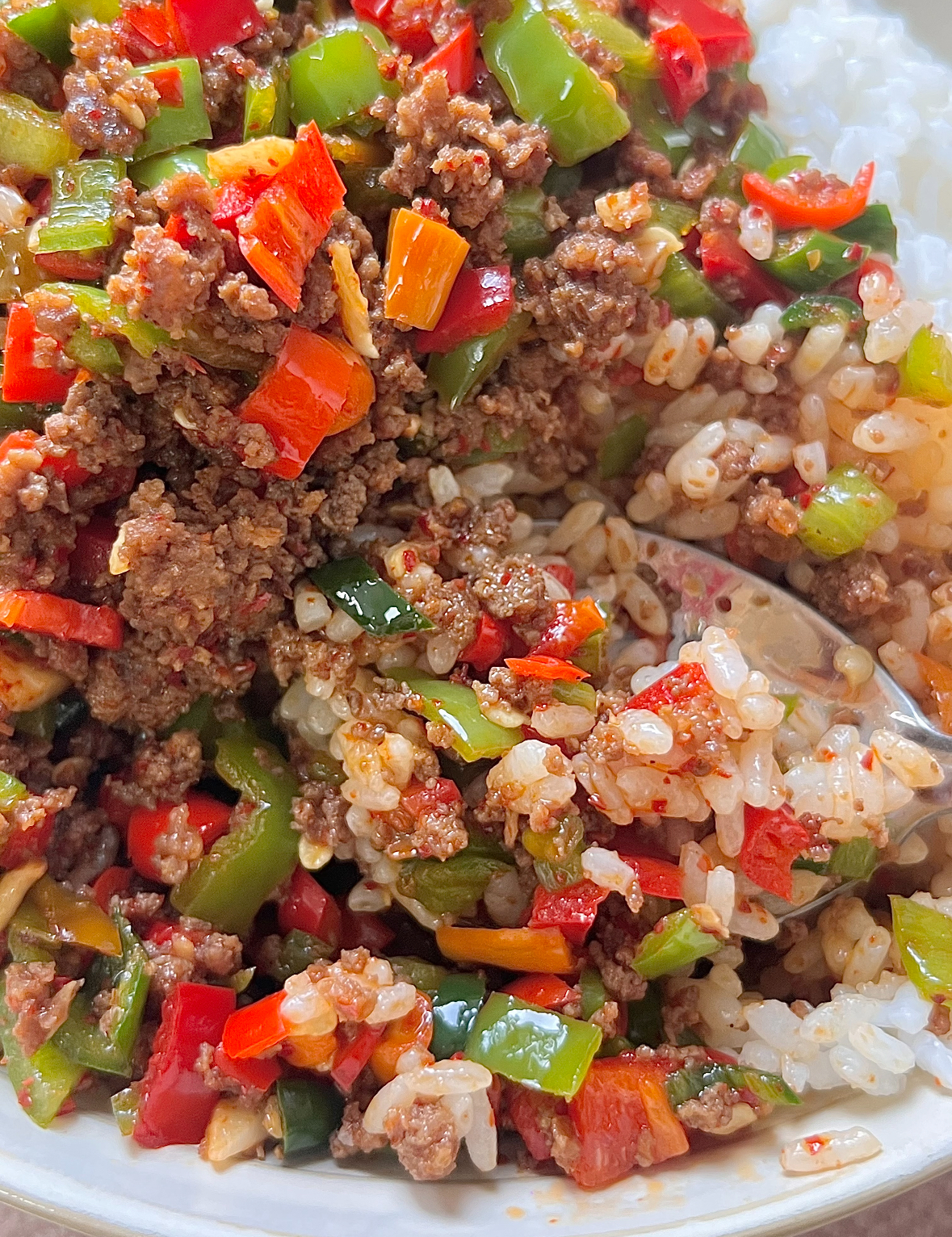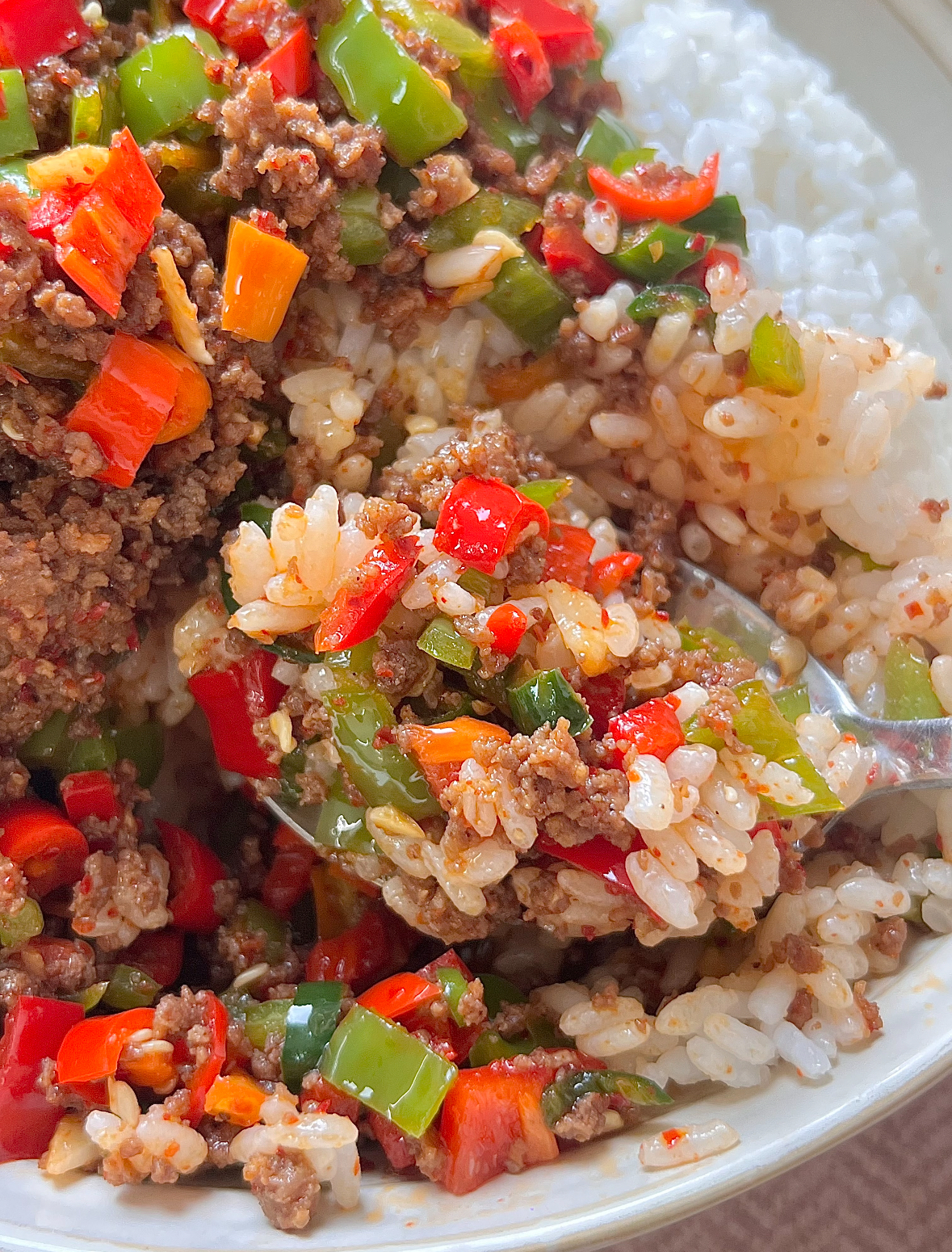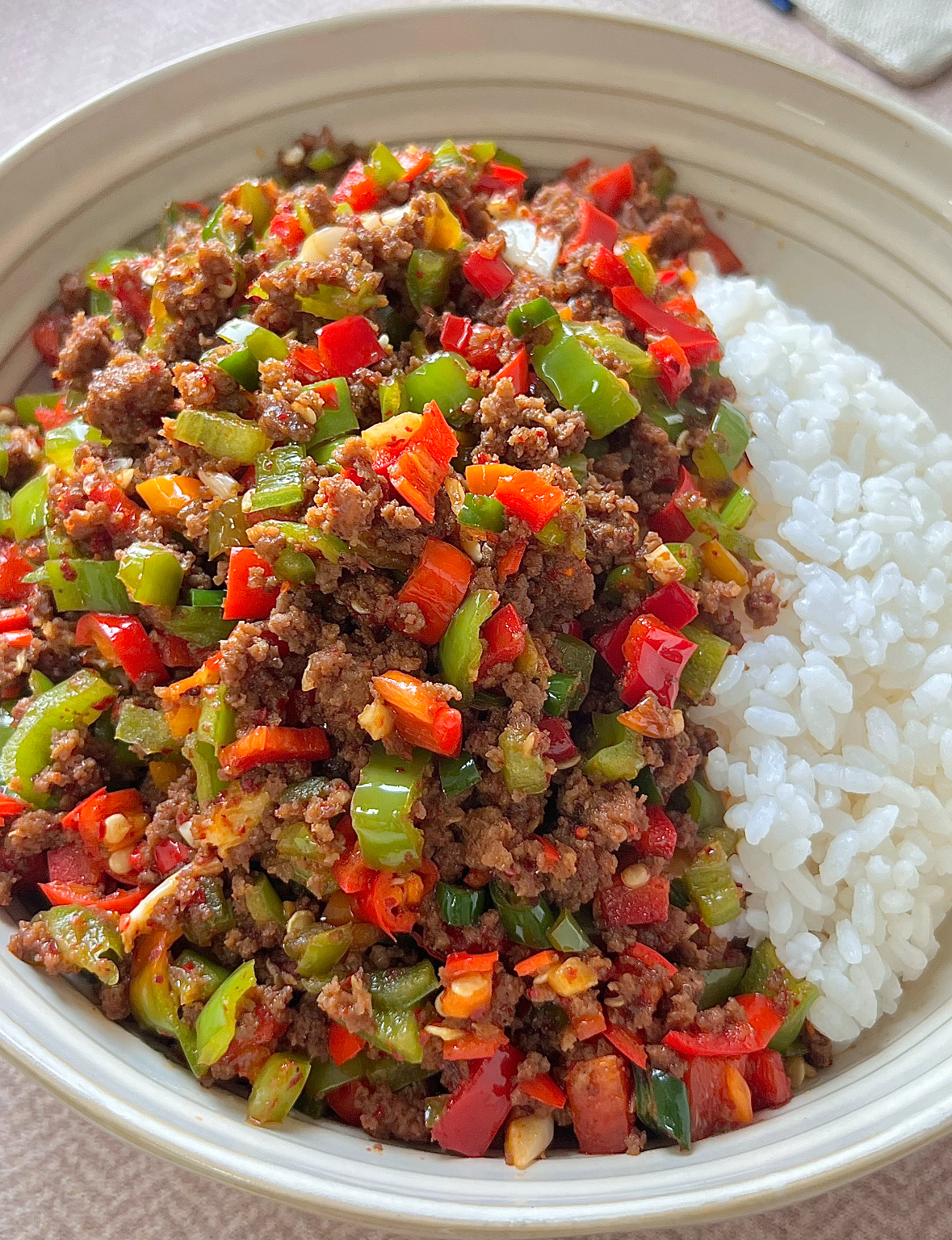 选择牛里脊等嫩滑部位。腌制时加淀粉和油能有效锁水。炒制时火要大,时间要短,快速滑炒避免牛肉变老变柴。这道菜的风味关键在于多种辣椒的复合运用:二荆条增清香,小米辣提辣劲,泡椒赋酸辣味。不能吃太辣可减少小米辣用量,以二荆条为主。大火快炒能保留食材口感和香气。炒这道菜油量要比平时炒菜稍多些,这样才够香,且不易粘锅。炒好的鲜椒碎牛肉除了直接配米饭,还可以:拌面条:作为面条的浇头,非常美味。用饼卷着吃,别有一番风味