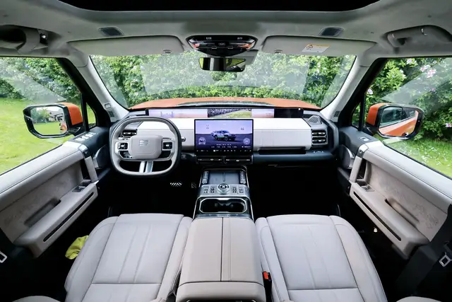 特别前段时间李学用开着它过长江,很多人惊呼:车船险白交了!究其原因,主要是其核心零部件防水靠谱,非空悬状态下涉水深度 900mm(差不多成年人及腰高度),开启空悬后能到 970mm—— 就算遇到水快漫到引擎盖的情况,也不用太慌。平时暴雨天过积水路段,或者想试着走浅滩,不用像开普通车那样怕进水,比很多同类型车的涉水能力更让人放心。
