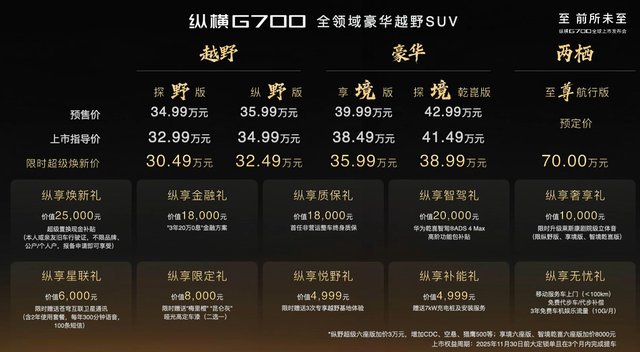 兄弟们,出大事了!前几天刚刚开过长江的纵横G700今天终于上市了,新车共推出4款配置车型,官方售价为32.99万-41.49万元。限时超级换新价30.49万——38.99万,值得一提的是还推出了预订价70万的至尊航行版!