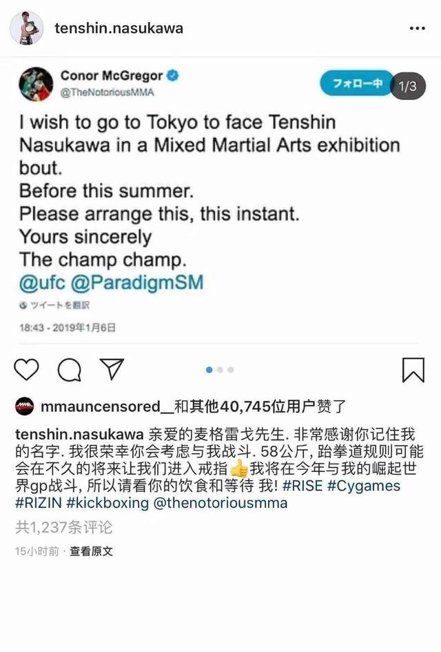 在梅威瑟vs那须川天心的消息刚刚传出来的时候,嘴炮公开怼梅威瑟欺负人,并且将那须川天心认成了成龙。当时还被国内的一些媒体称之为辱华言论。但是在比赛打完之后,有开始拉下面子去挑战人家,结果反被那须川天心将了一军。