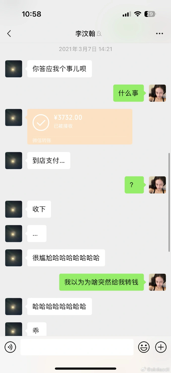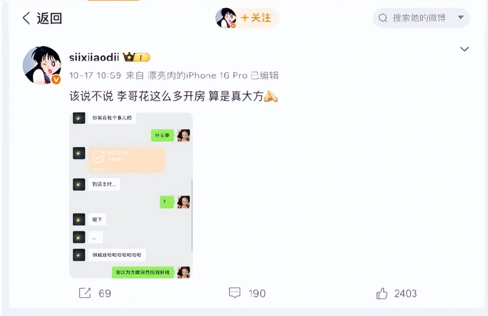司晓迪的指控堪称 “精准引爆”——10月 0日凌晨两点,她用 @siixiiaodii 账号艾特李云迪,抛出三个关键信息:瑰丽酒店的见面、安眠药后的 “龌龊勾当”、事后被拉黑的结局。为佐证说法,她晒出两张截图:一张显示微信消息被 “拒收”,另一张是标注 “到店支付” 的3732元转账记录,配文里一句 “我现在可是神经病,别惹我” 更添火药味。