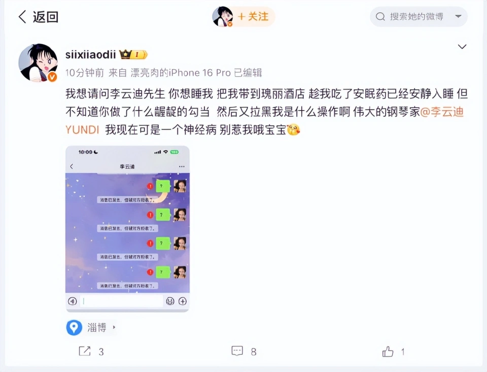 “伟大的钢琴家,趁我吃安眠药睡着后做龌龊事,拉黑我是什么操作?”10月30日凌晨,李汶翰前女友司晓迪的一条微博炸穿热搜,直指沉寂四年的李云迪将其带至北京瑰丽酒店,趁她昏睡实施不当行为,事后火速拉黑联系方式。这条附带 “被拉黑截图” 的指控仅存半小时就被删除,却引发2亿次阅读狂潮,一边是 “爆料惯犯” 的连环操作,一边是 “前科艺人” 的沉默应对,这场疑点重重的闹剧,比影视剧更抓马。