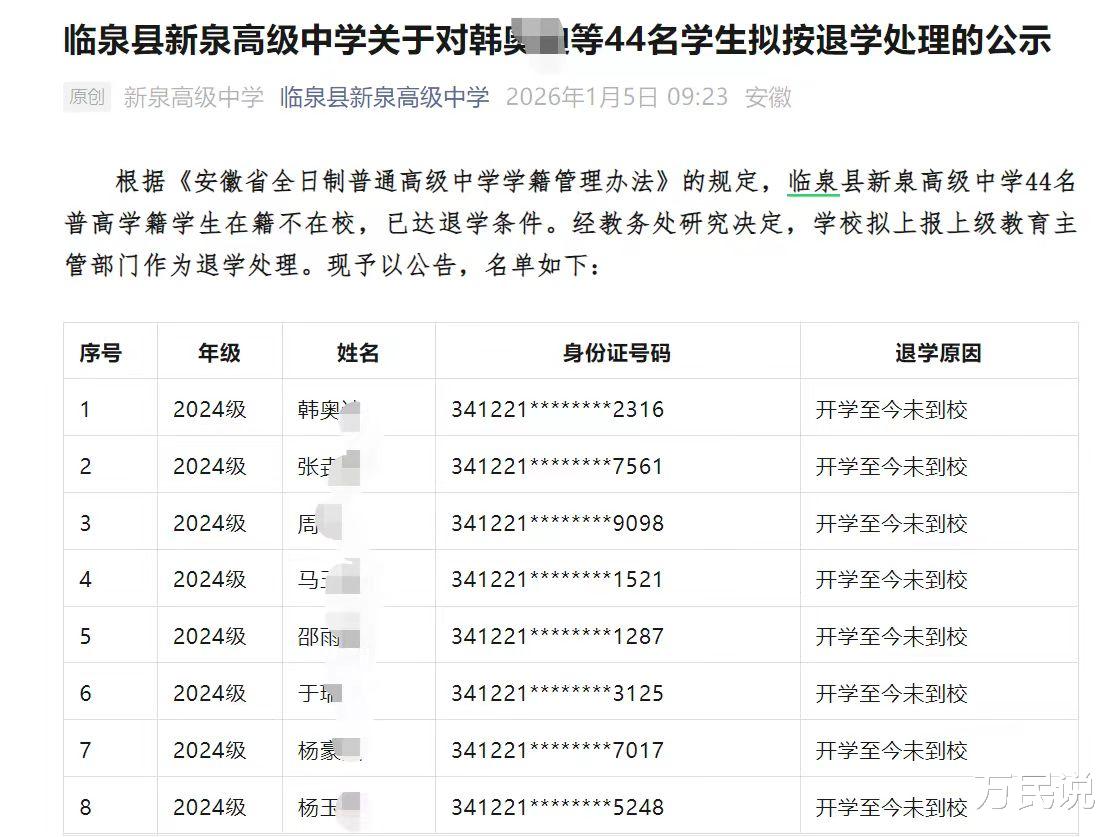 据校方公告,这44名学生均系“在籍不在校”,且状态已持续近一年半。自2024年秋季入学成为高一新生后,他们便未曾踏入校园。依据《安徽省全日制普通高级中学学籍管理办法》,学校经教务处研究,决定上报主管部门作退学处理。