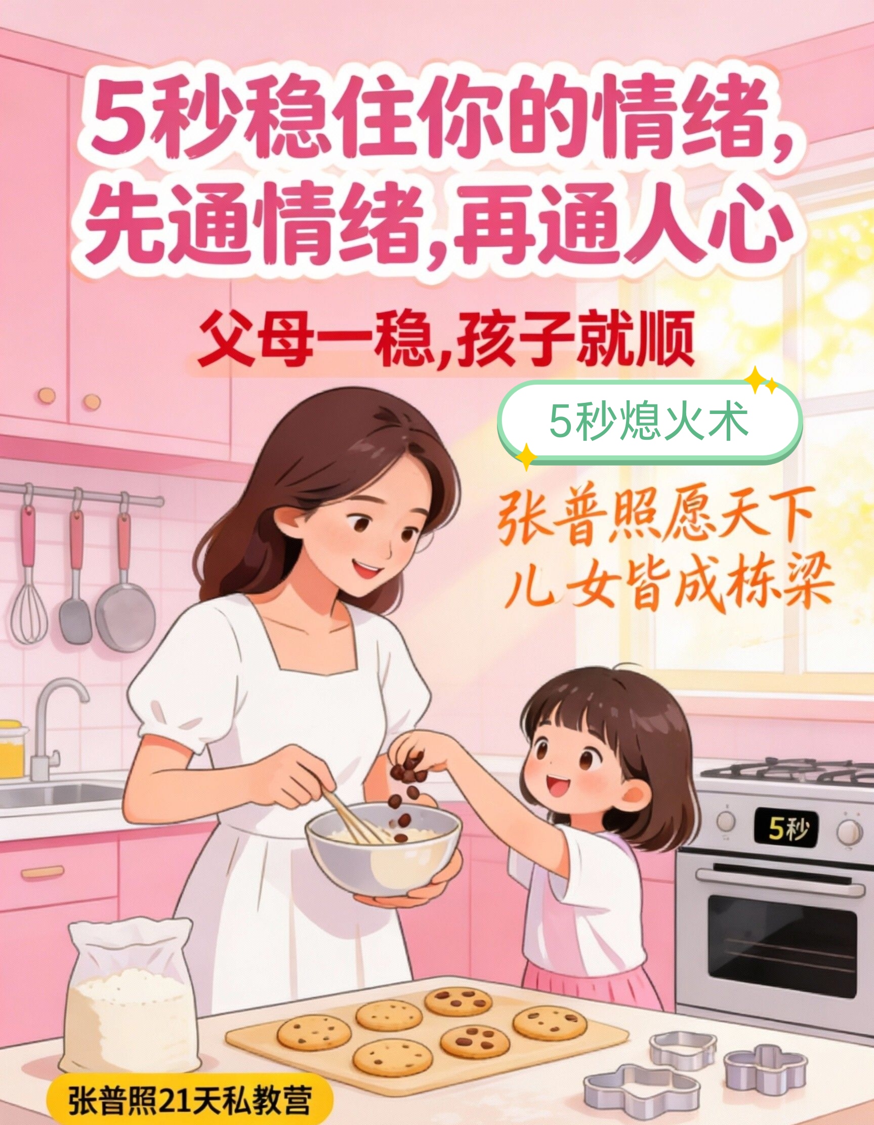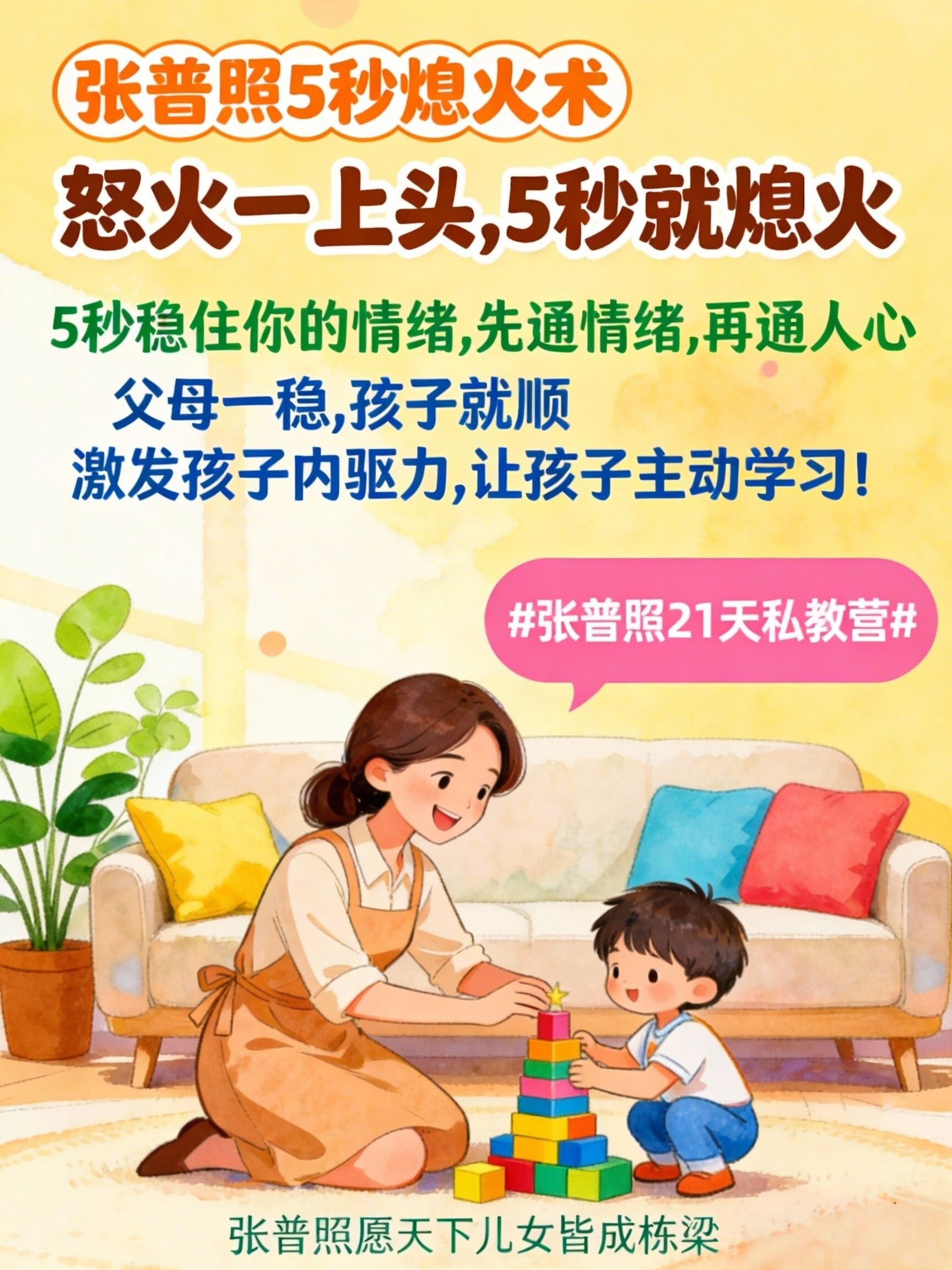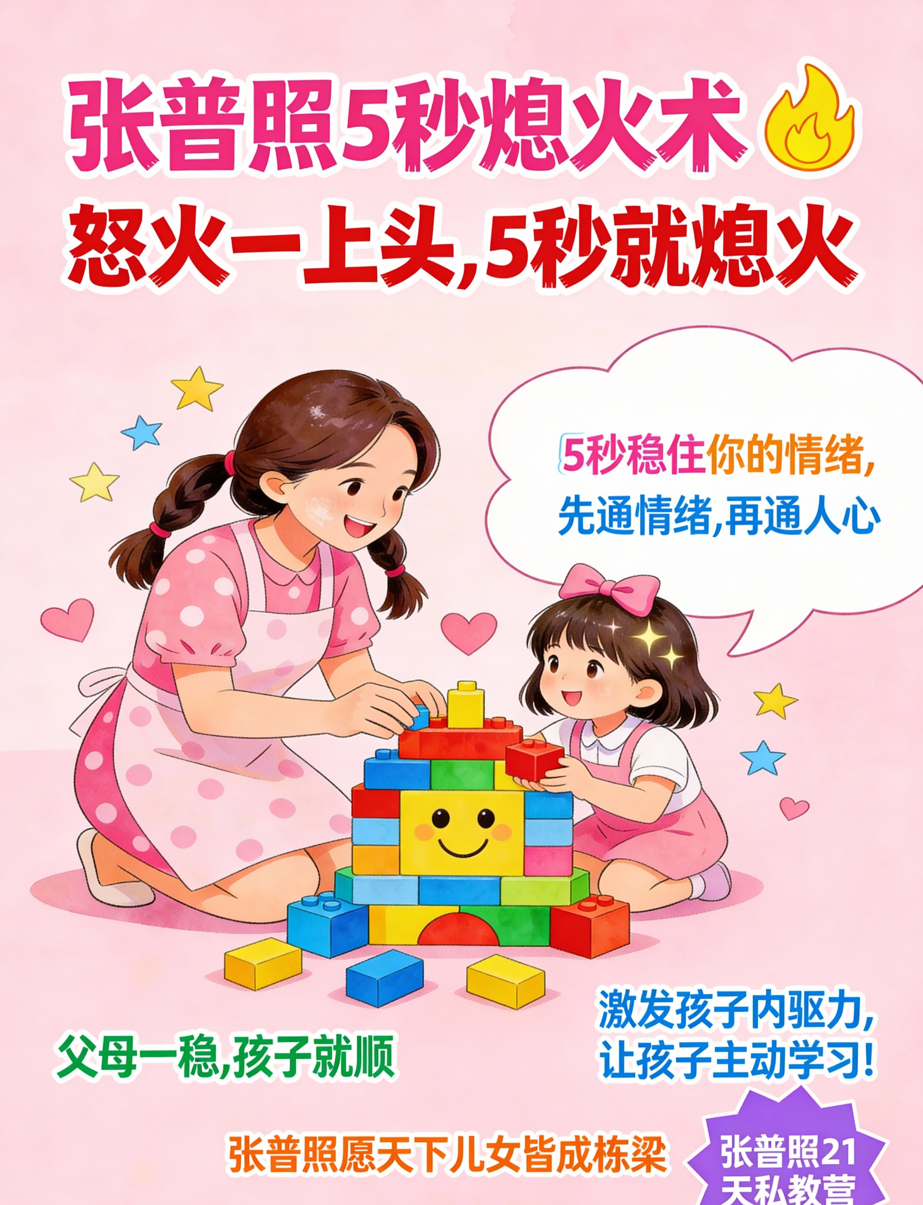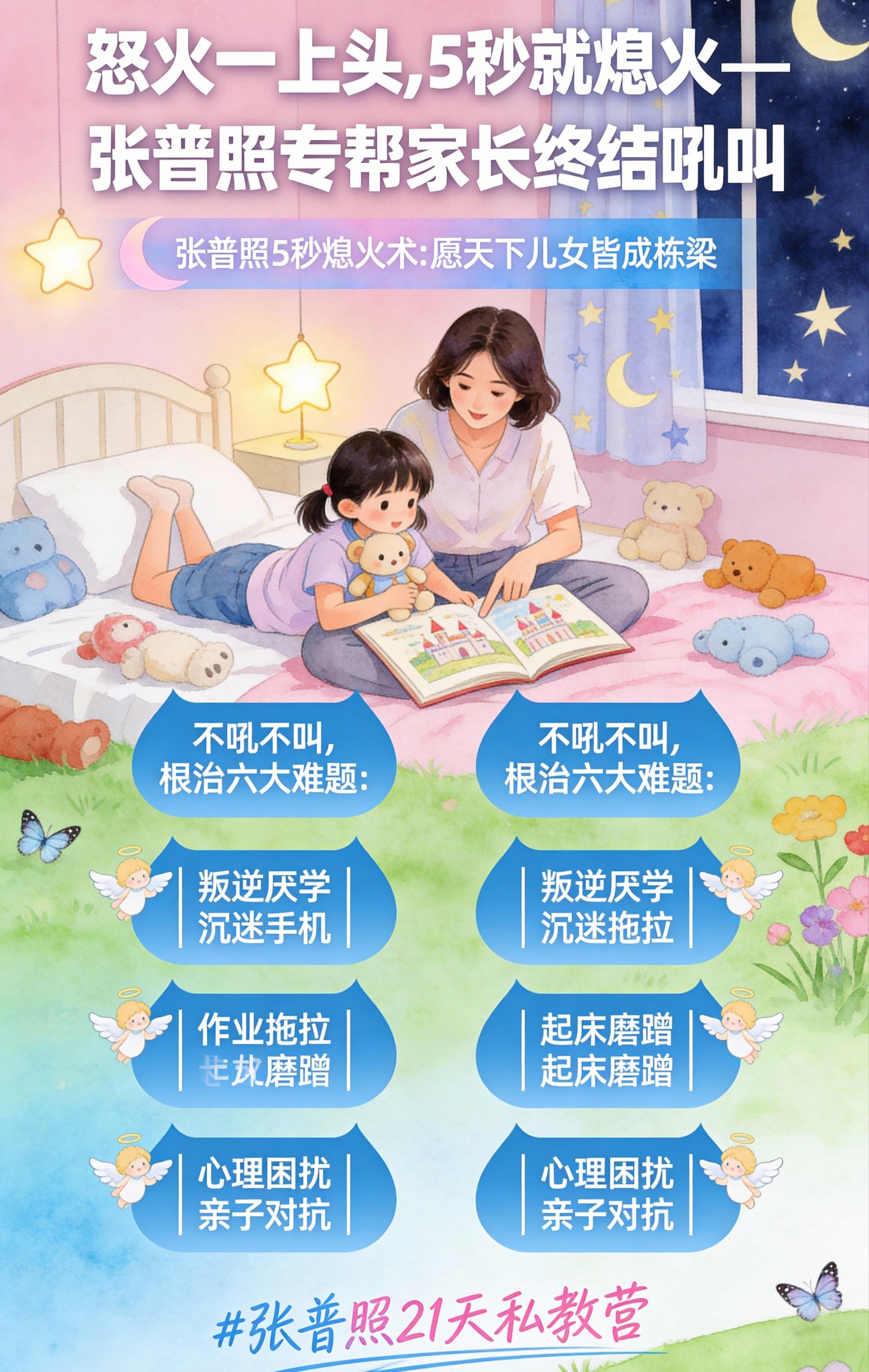 张普照5秒熄火术,就是帮你从根源上净化睡前的情绪环境。它不止让你“不发火”,更是通过让你在情绪失控前5秒 重获平静,为你和孩子创造一个柔和、松弛、充满安全感的睡前“心理襁褓”。