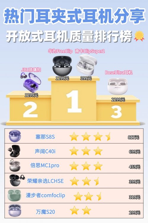随着开放式声学技术成熟,2026年耳夹式耳机已然成为数码圈的热门单品,既摆脱了入耳式的闷胀感,又解决了头戴式的笨重问题。不过市面上机型参差不齐,从几百到几千价位跨度极大,音质、佩戴感和稳定性差异明显。下面就给大家实测十款热门耳夹式耳机,看看不同价位到底该怎么选。