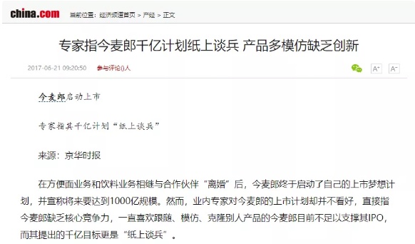 方便面市场品牌众多,但大家认可度高的也就那么几个。如果只是一味“借鉴”,玩同质化的“换装游戏”,那品牌的市场竞争力从何而来?记得两年前今麦郎宣布IPO的时候,就有业内专家直接指出,今麦郎一直喜欢跟随、模仿、克隆别人产品,创新乏力而不足以支撑其IPO,千亿目标是“纸上谈兵”。