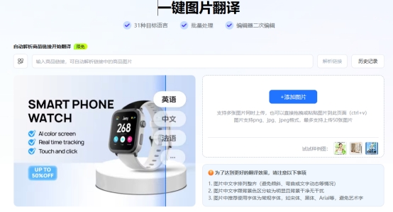 对于跨境卖家、电商运营者来说,易可图提供的图片翻译功能是一个值得收藏的功能。它不仅能自动识别图片中的文字内容,还可以结合内置的翻译引擎将识别出的文字翻译为目标语言,并呈现在图像上。